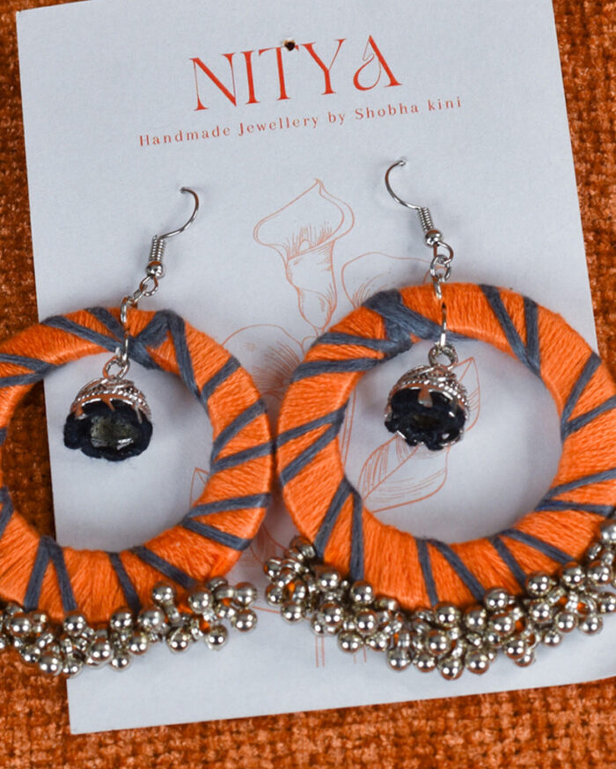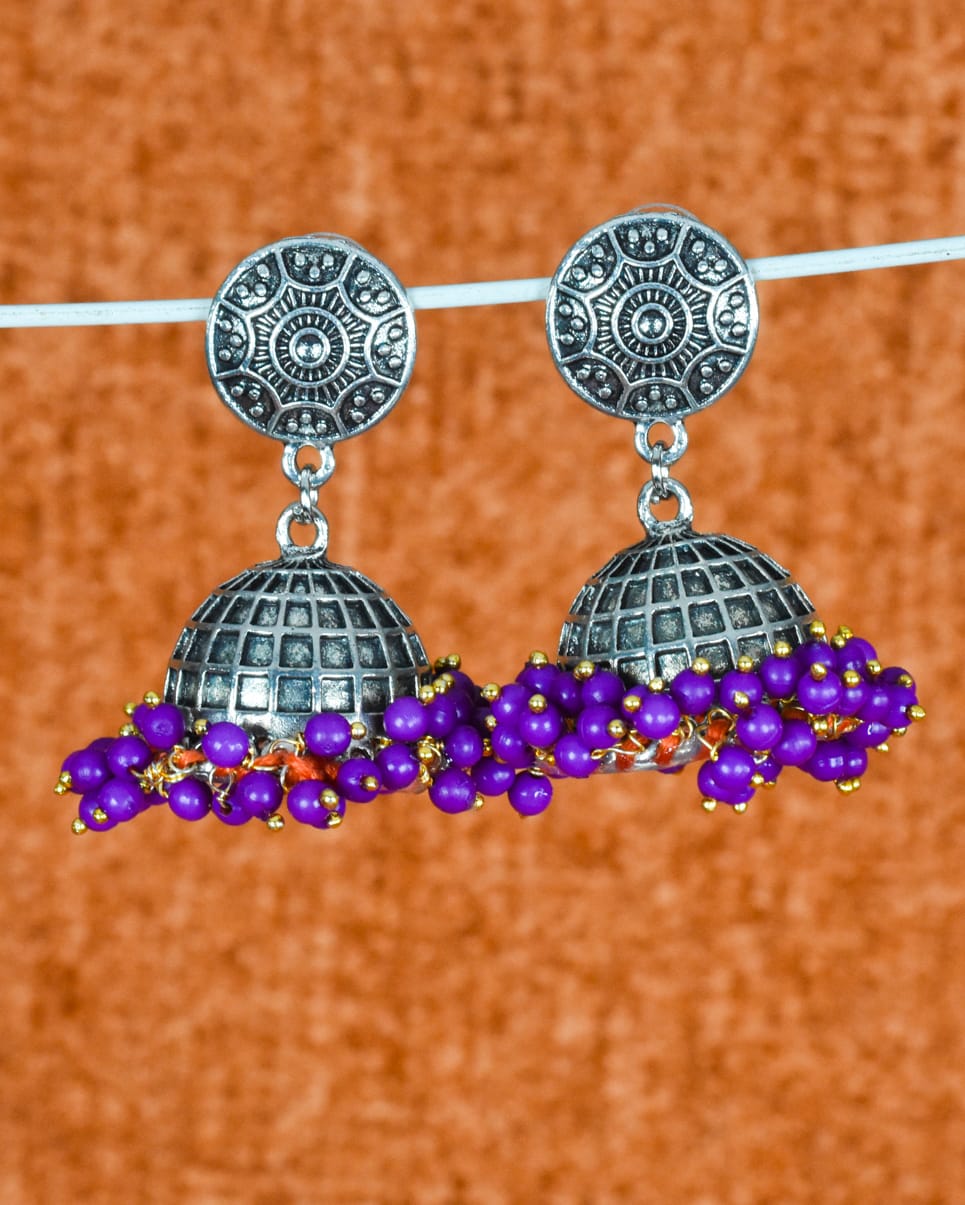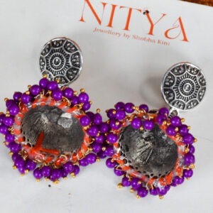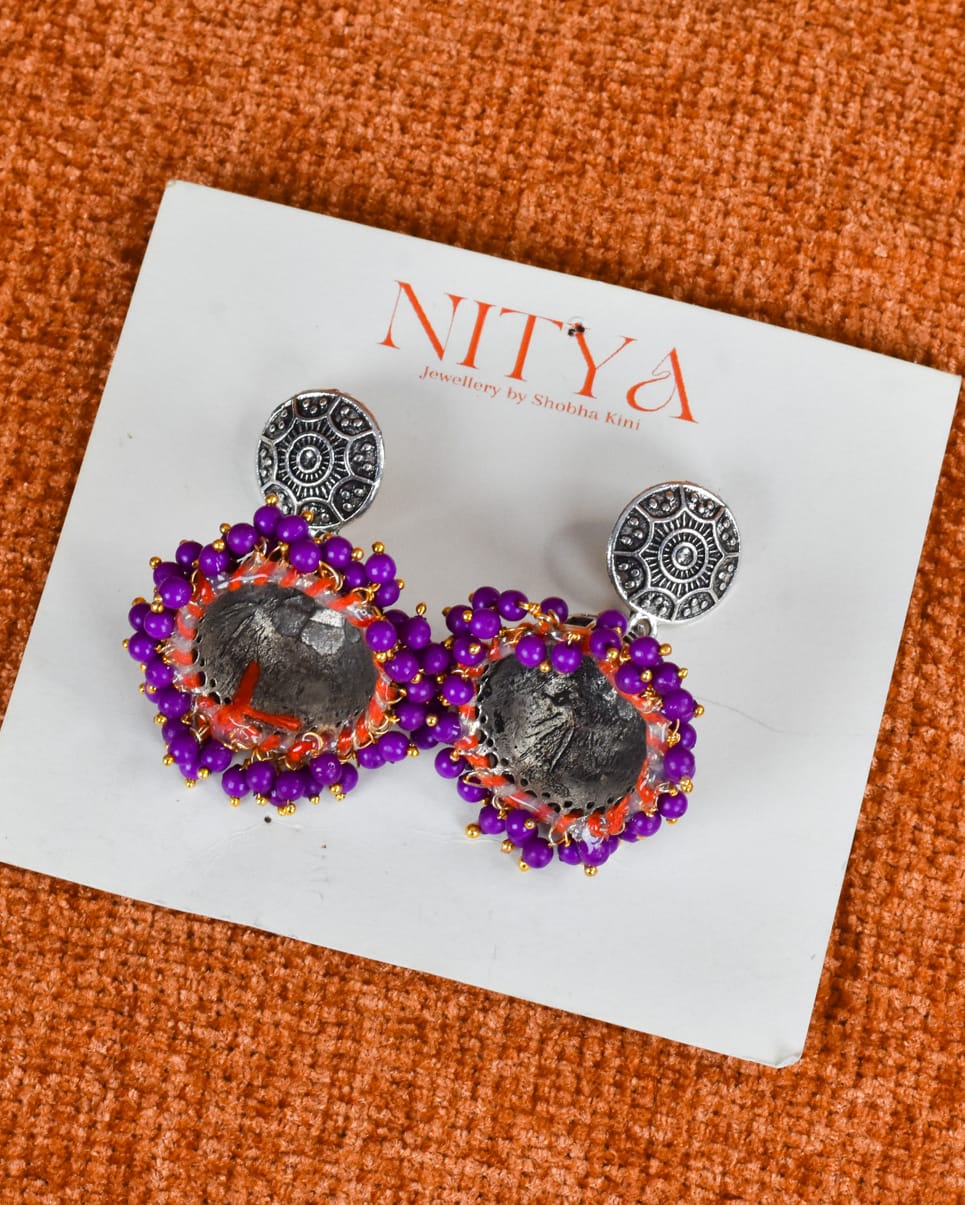Crafted in a bold purple hue, these jhumka earrings radiate the vibrance of Navratri nights. Oxidised silver domes are beautifully bordered with purple beads and red thread detailing, creating a striking fusion of tradition and festive flair. A statement accessory designed to complement your chaniya choli and add drama to every garba twirl.