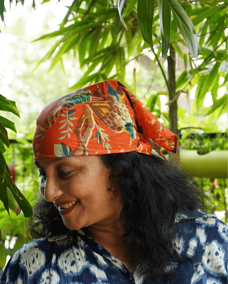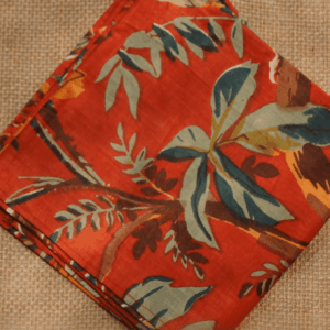 Inspired by lush forest motifs, this vibrant orange bandana features a mix of botanical and bird prints in earthy and teal tones.