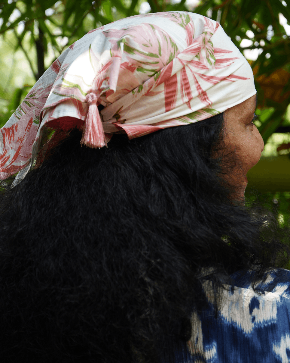 Soft and feminine, this off-white bandana features pastel pink leaf motifs with green highlights and is finished with delicate blush tassels.