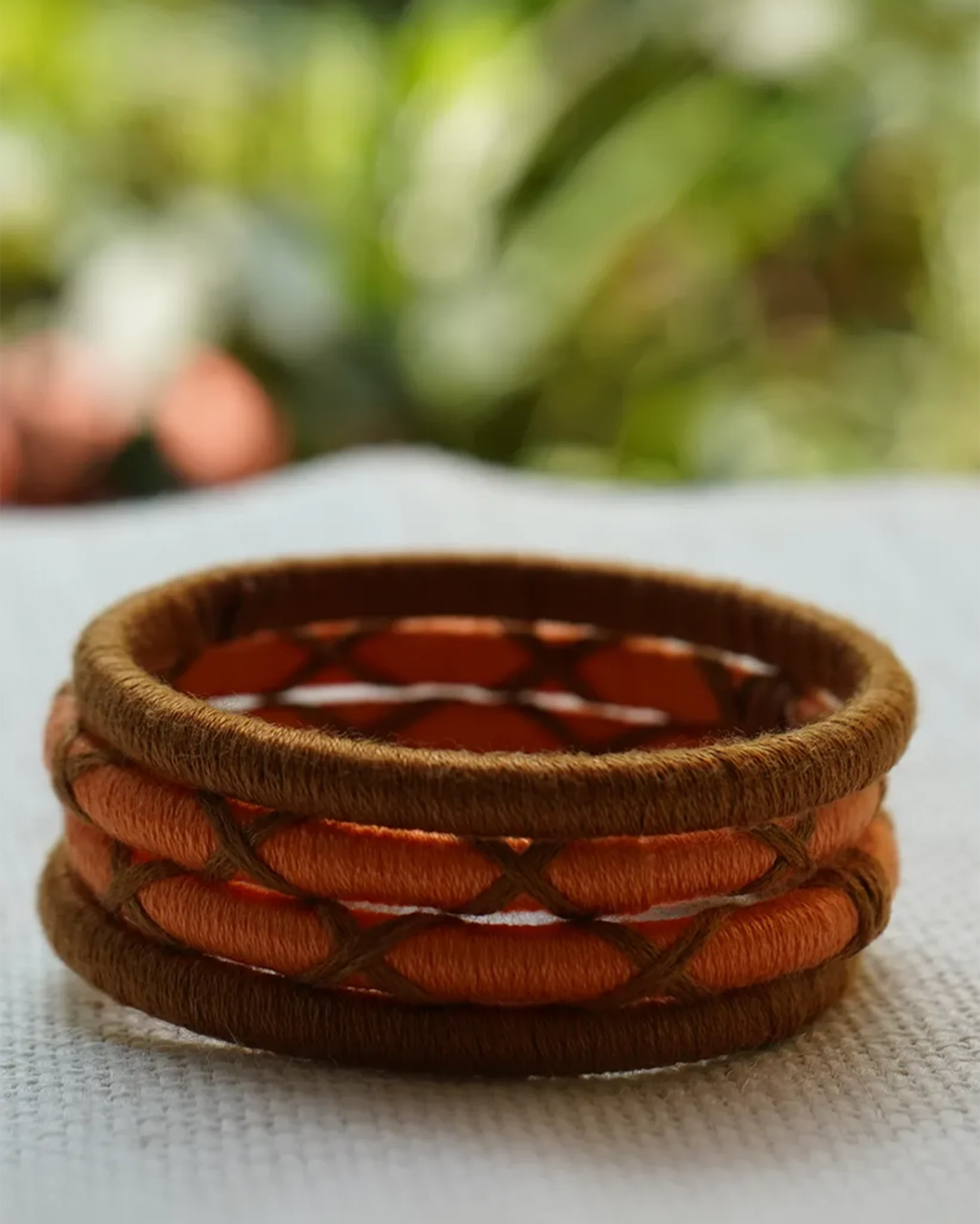Bright and playful, these handcrafted bangles capture the vibrant rhythm of Navratri nights. Wrapped in bold orange and royal blue threads, they’re adorned with mirrors, green criss-cross threadwork, and tiny metallic ghungroos that create a subtle jingle with every move. A perfect accessory to match the energy of garba and dandiya evenings.