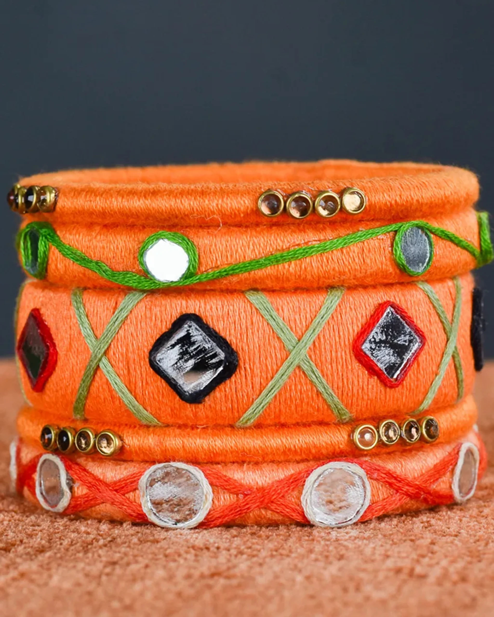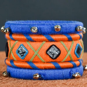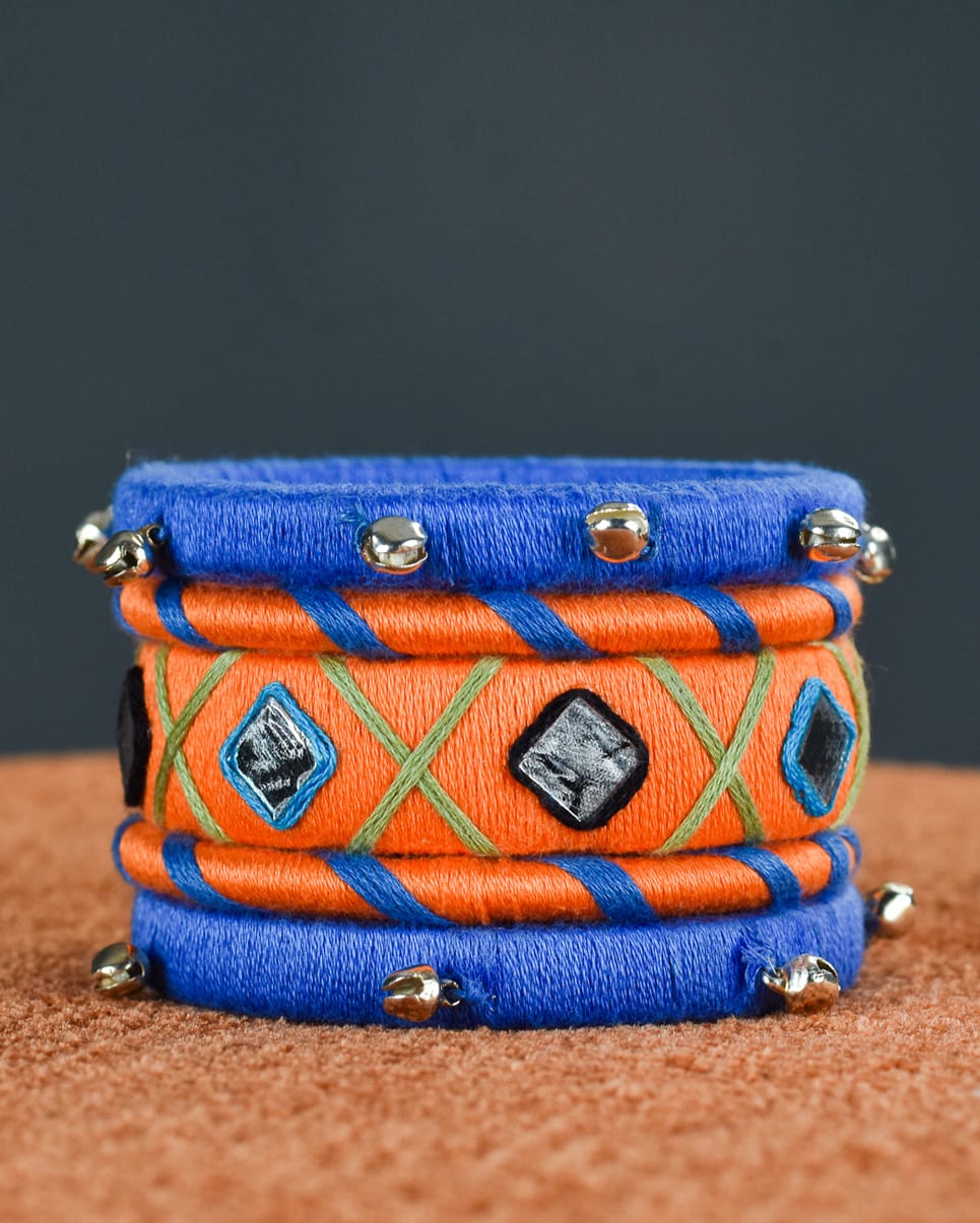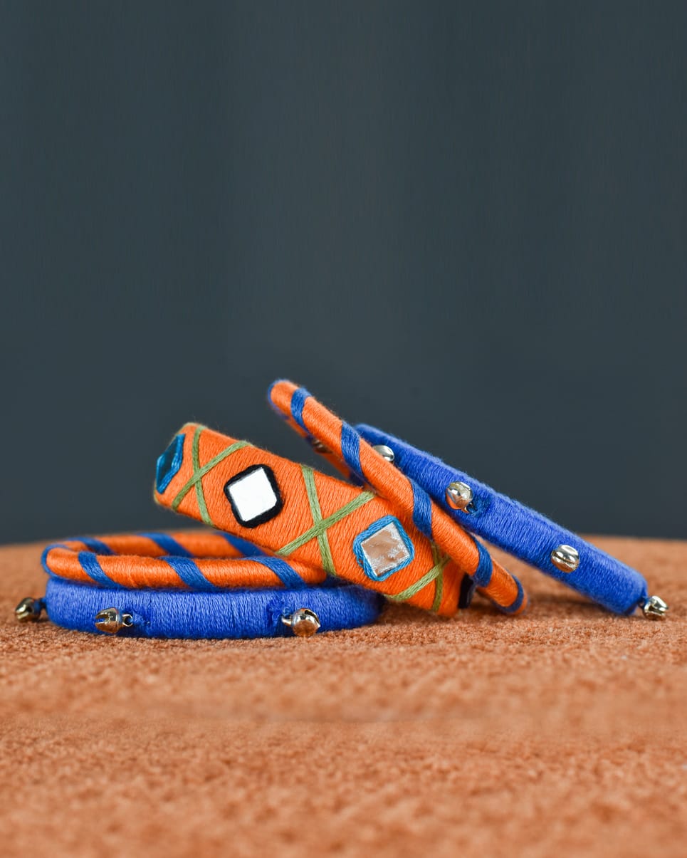Materials: Cotton threads (orange, blue, green), embedded mirrors, metallic ghungroos, and sturdy base bangles.