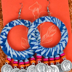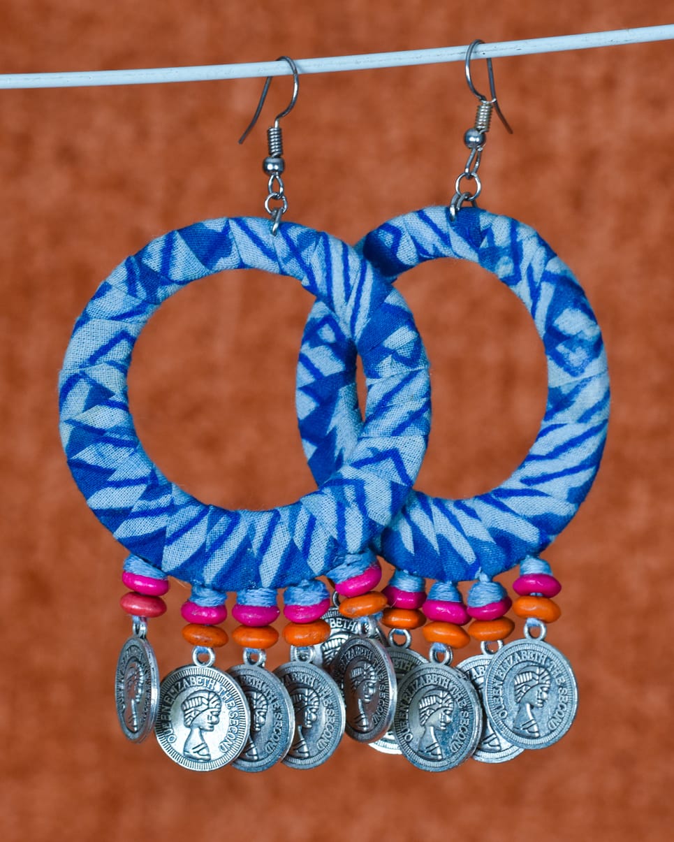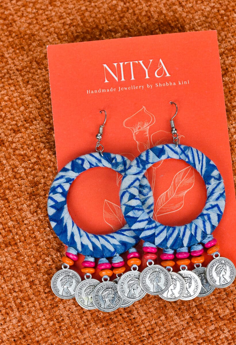 Celebrate the energy of Navratri nights with these indigo fabric-wrapped hoop earrings. Accented with vibrant wooden beads and dancing coin charms, they move with every twirl, making them the perfect companion for your dandiya and garba looks.