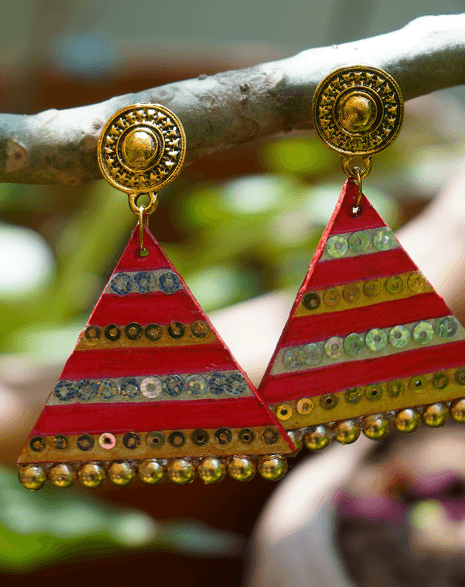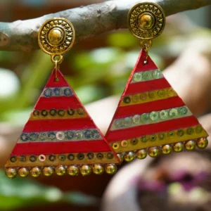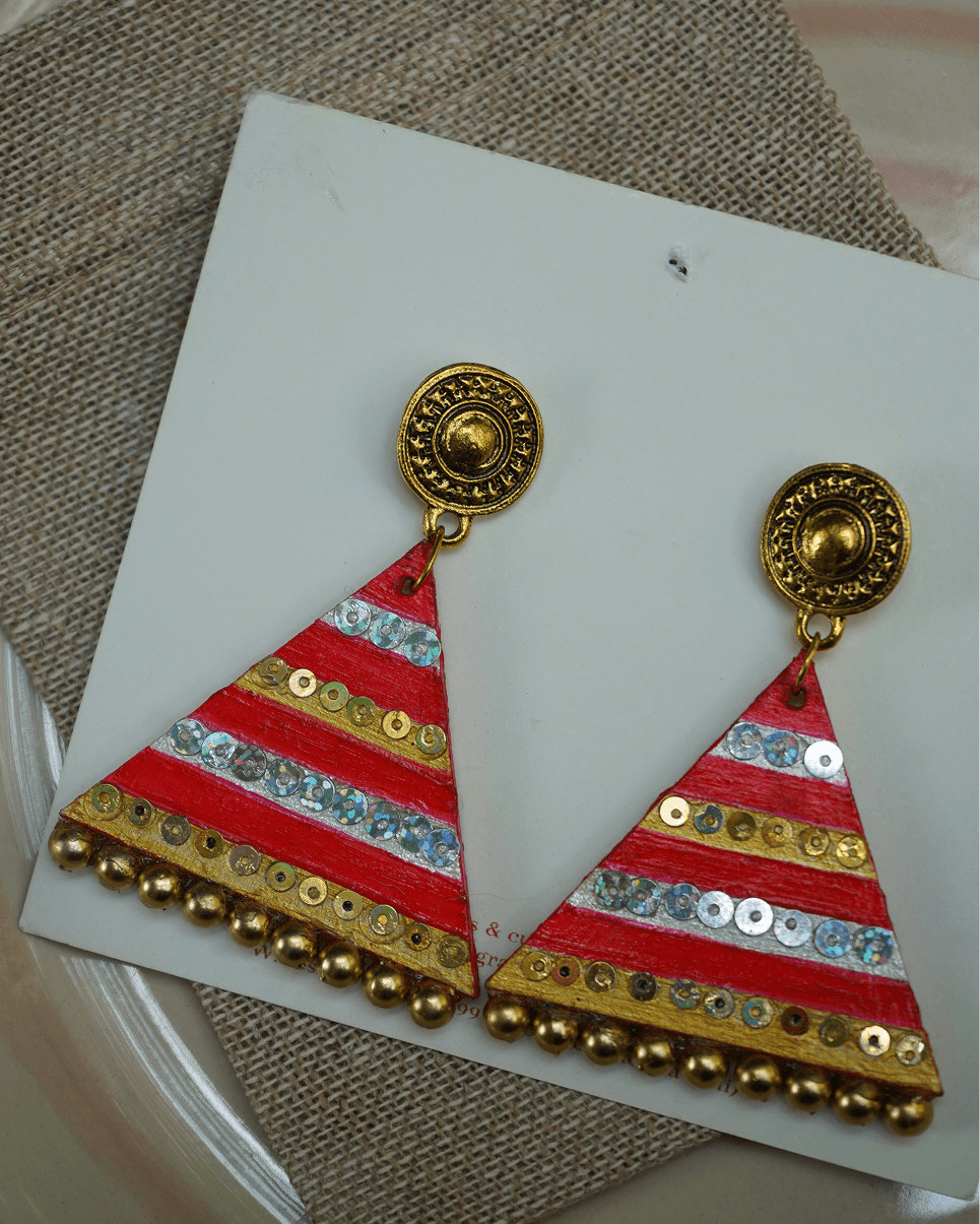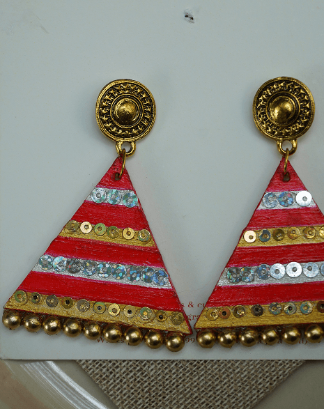 Bright, bold, and full of rhythm — these hand-painted triangle earrings sparkle with sequins and golden beads.Perfect for festive occasions where you want to shimmer, shine, and stand out.
