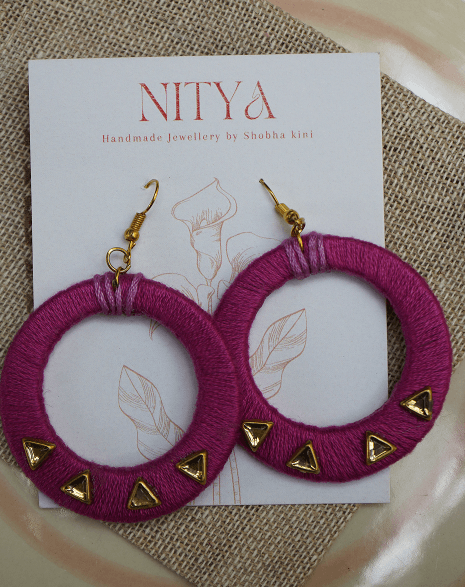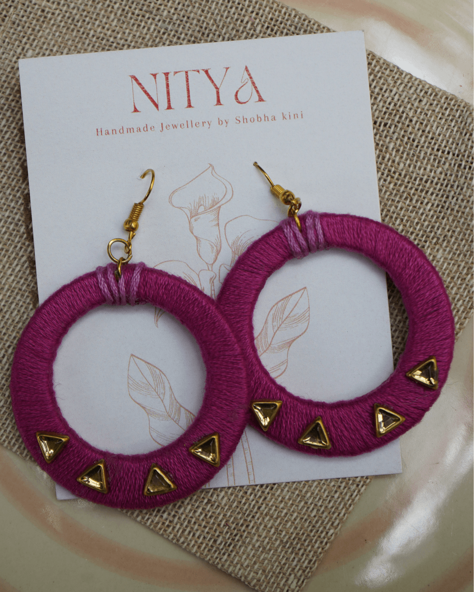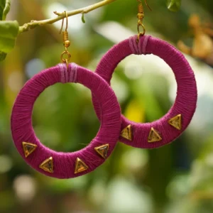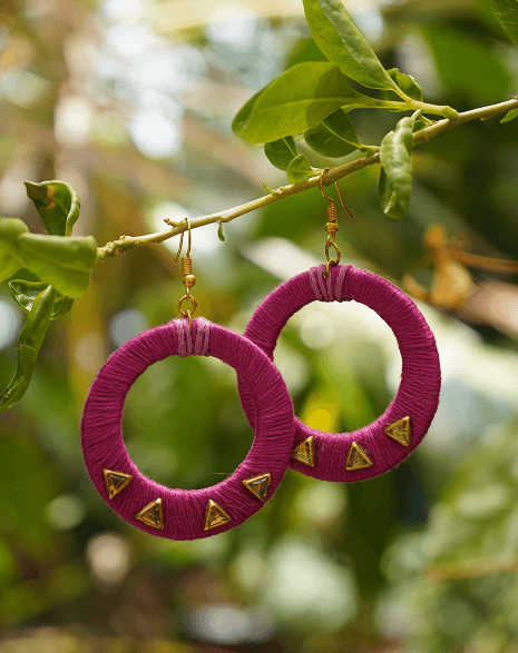 Vibrant and minimal, these magenta thread-wrapped hoops are adorned with golden triangle accents for a modern ethnic edge. Lightweight and effortlessly stylish, they’re perfect for day outings, festive brunches, or casual get-togethers.