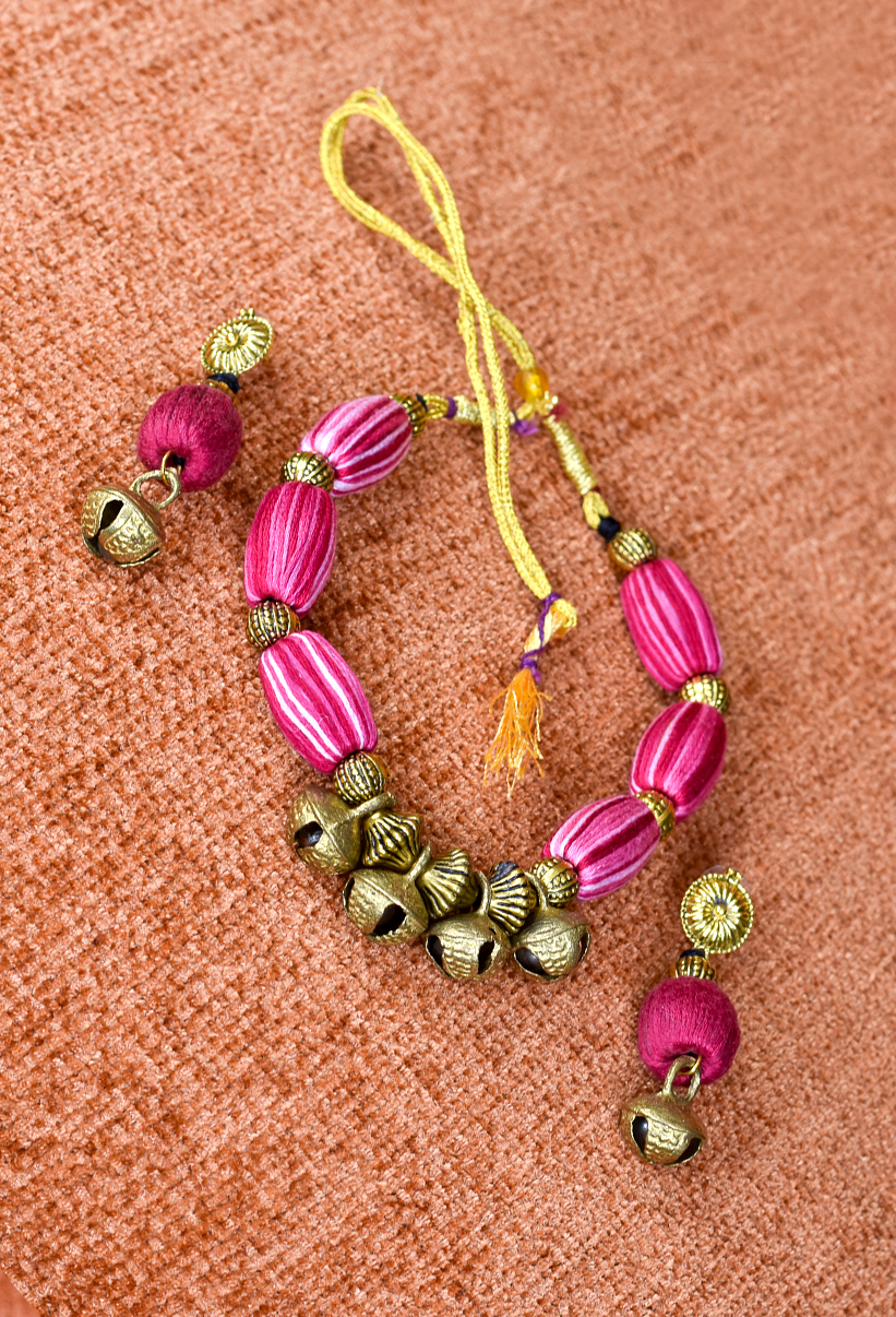 The Gulabi Ghungroo Necklace Set is an ode to timeless femininity. With its rich pink hues and golden ghungroos, it pairs perfectly with ethnic ensembles — adding a cheerful sparkle to your Diwali look.