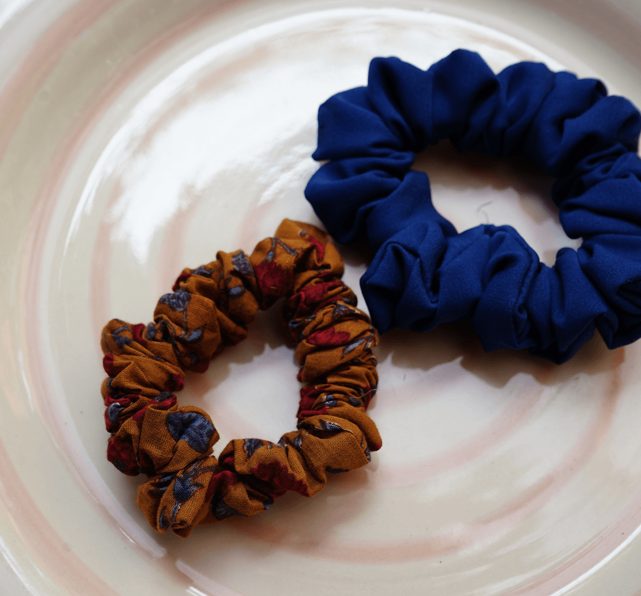 Bold navy meets earthy floral in this scrunchie set—perfect for elevating both your everyday and festive hairstyles. Rich tones, soft hold.