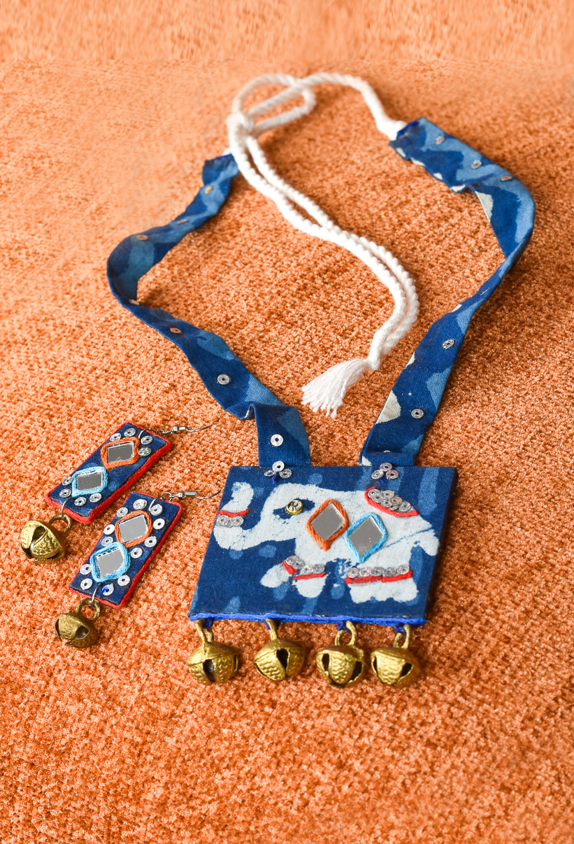Material: Hand-dyed cotton fabric, brass ghungroos, and cotton thread