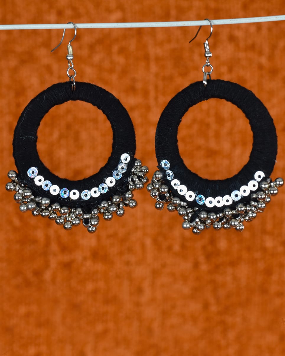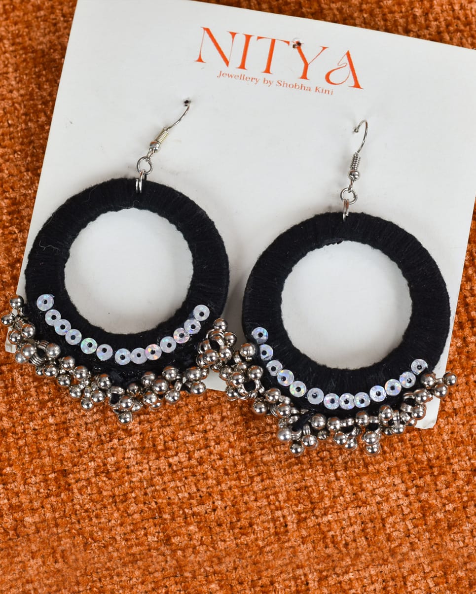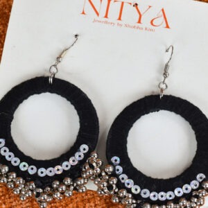 Bold and graceful, these handcrafted black hoop earrings are designed for the fierce nights of Navratri. Wrapped in fine black thread, adorned with shimmering sequins, and finished with silver ghungroo clusters, they bring drama and elegance to every twirl. Perfect for adding a striking edge to your festive look.