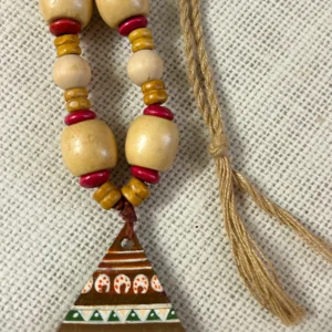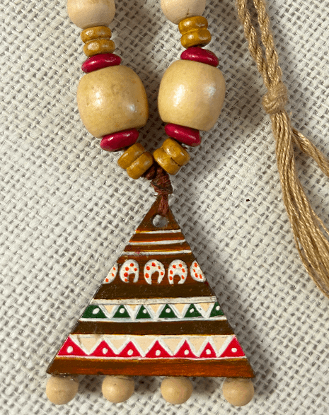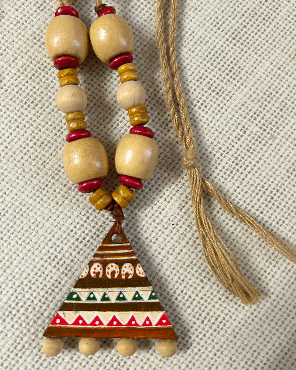 A celebration of folk artistry, this handcrafted necklace with earrings features a vibrant triangular pendant painted with traditional motifs and paired with smooth wooden beads for an earthy, timeless look.