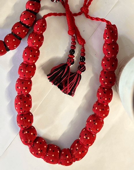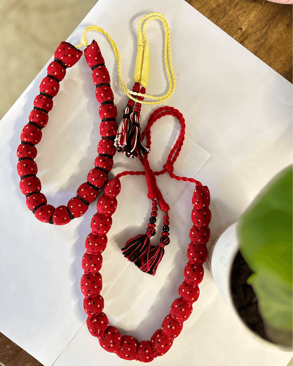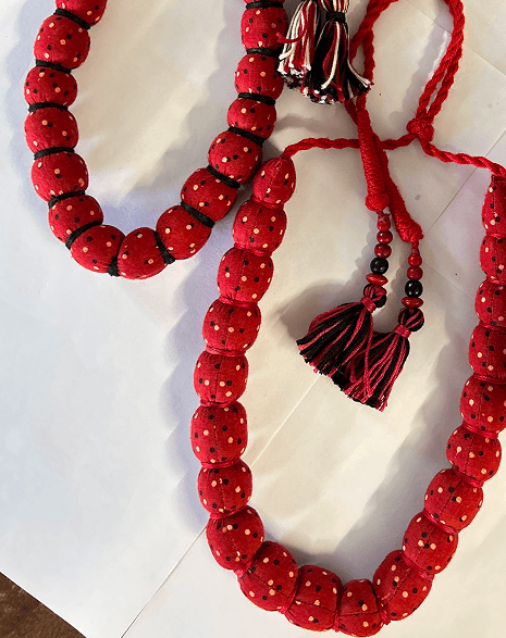 Striking red fabric bead necklaces with dainty polka dots and handcrafted tassels. A playful blend of tradition and charm, perfect for festive flair or a bold everyday look.