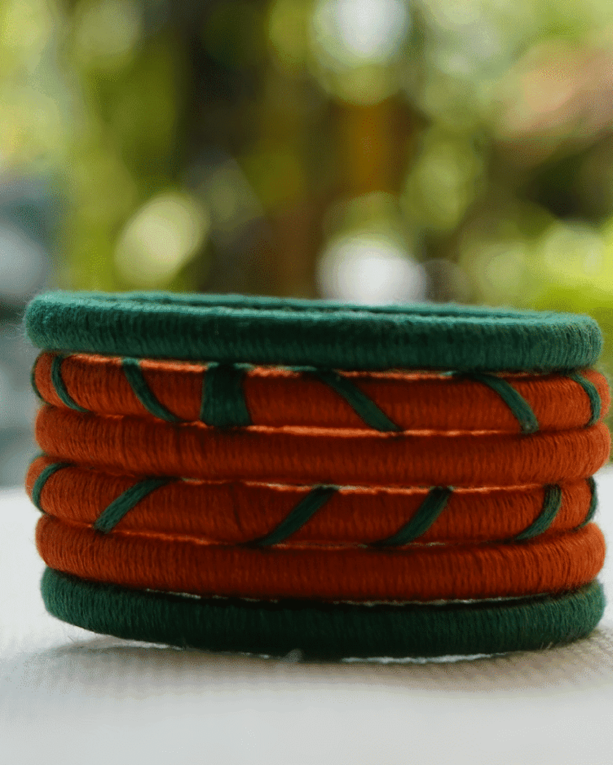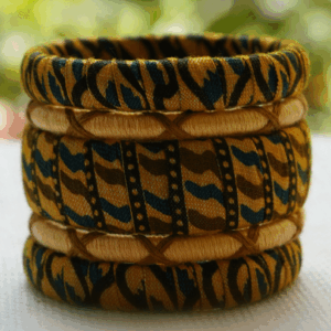 Material: Printed cotton fabric and thread-wrapped plastic bangles