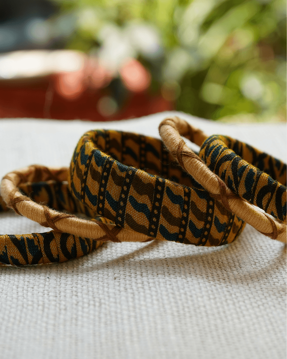 Featuring mustard and indigo printed fabric alongside soft golden thread wraps, this set brings together rustic elegance and handcrafted charm.