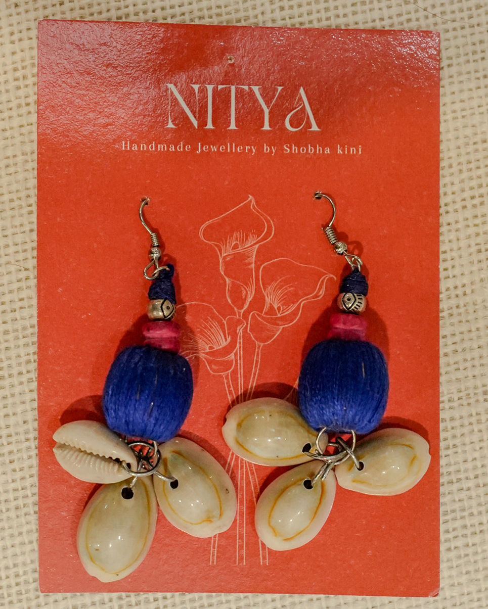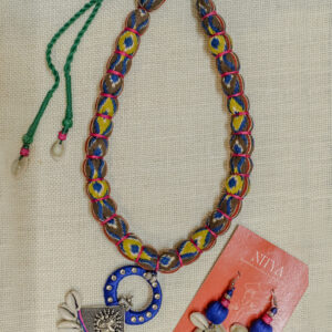 Inspired by the tranquil beauty of the blue lotus, Neel Kamal Set embodies divine calm and festive elegance. This handcrafted set features a statement necklace and matching earrings adorned with ikat fabric beads, cowrie shells, and oxidized silver detailing. A harmonious blend of oceanic hues and artisanal charm, it’s the perfect pick for festive evenings and cultural celebrations.