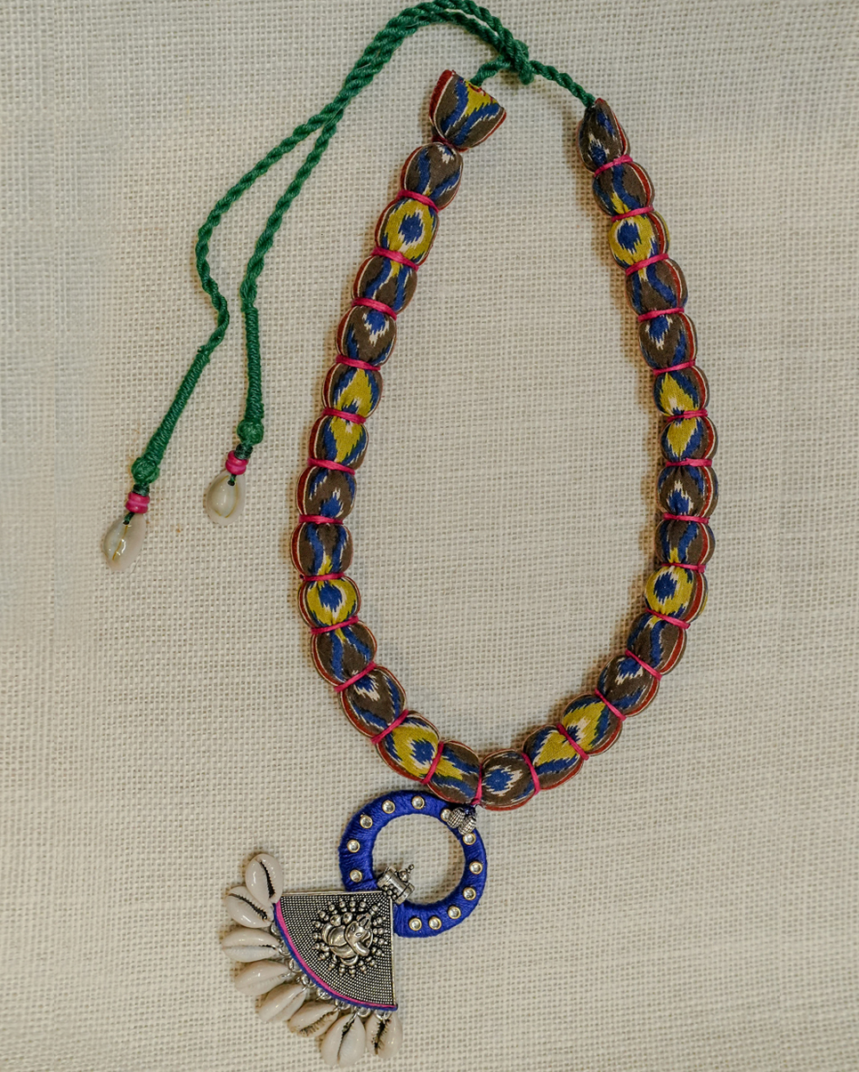 Material: Fabric-wrapped beads, cowrie shells, oxidized metal pendant, and adjustable cotton thread