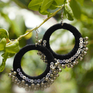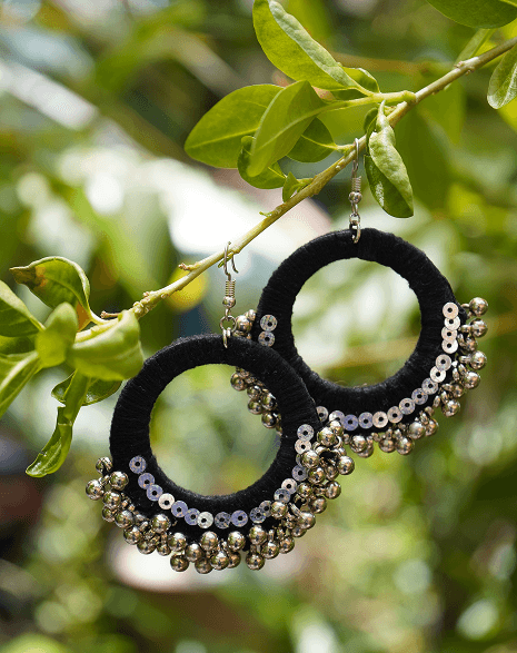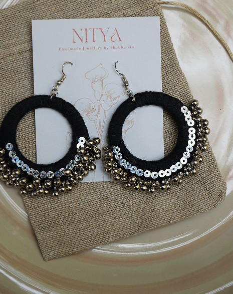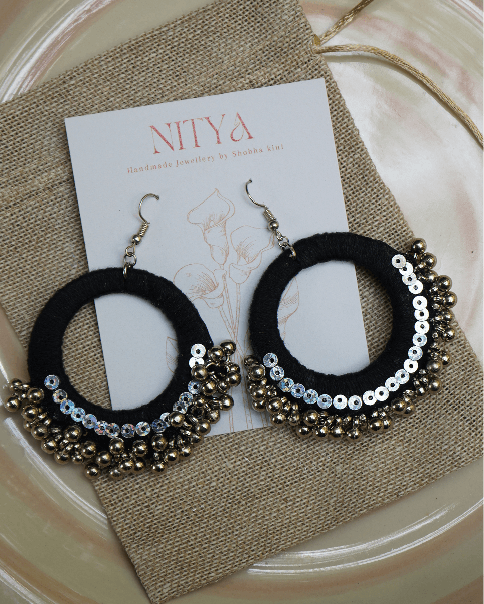 These black thread-wrapped hoops sparkle with iridescent sequins and a playful fringe of metallic beads.