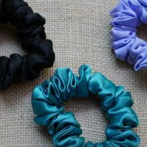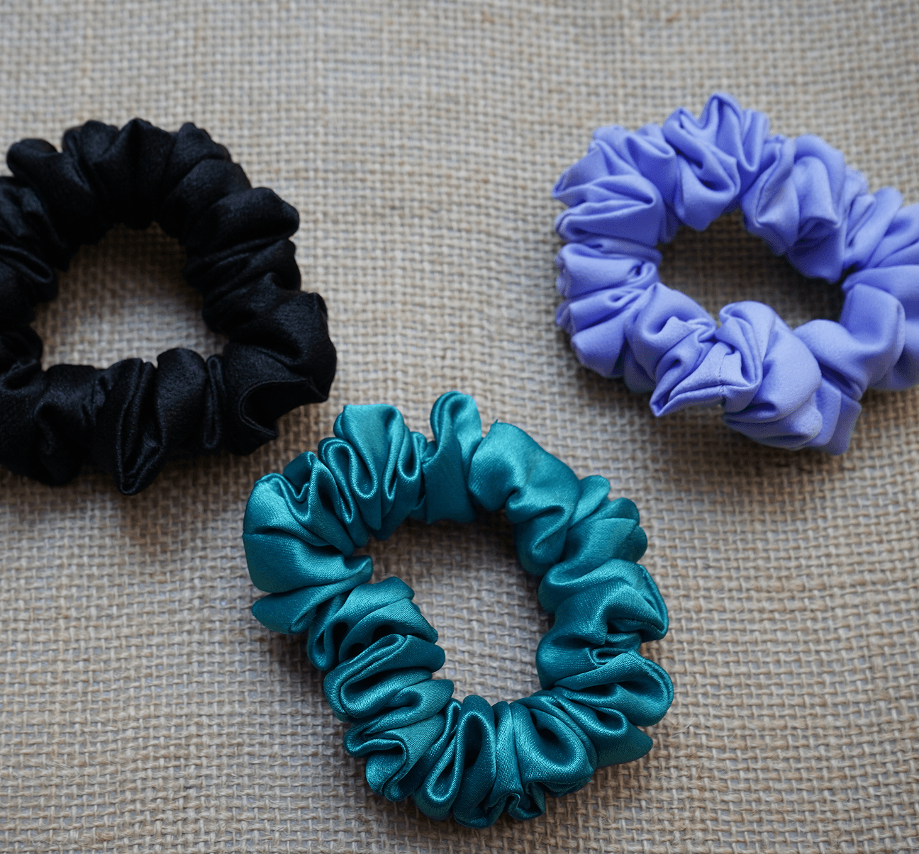 A vibrant set of 3 scrunchies in satin and crepe that add the perfect pop of cool tones to your look.