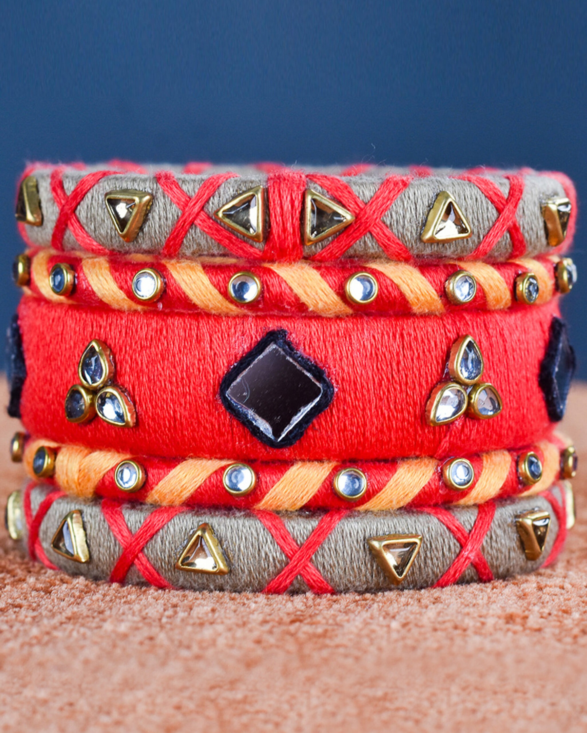 The Prabha Bangles embody the joyful radiance of Diwali — vibrant, handcrafted, and full of life. Wrapped in traditional ikat fabric with hues of mustard, indigo, and vermilion, these bangles capture the essence of flickering diyas and festive spirit. Lightweight and earthy, they pair beautifully with sarees, kurtas, or even contemporary wear — bringing a touch of heritage to every celebration.