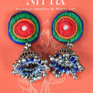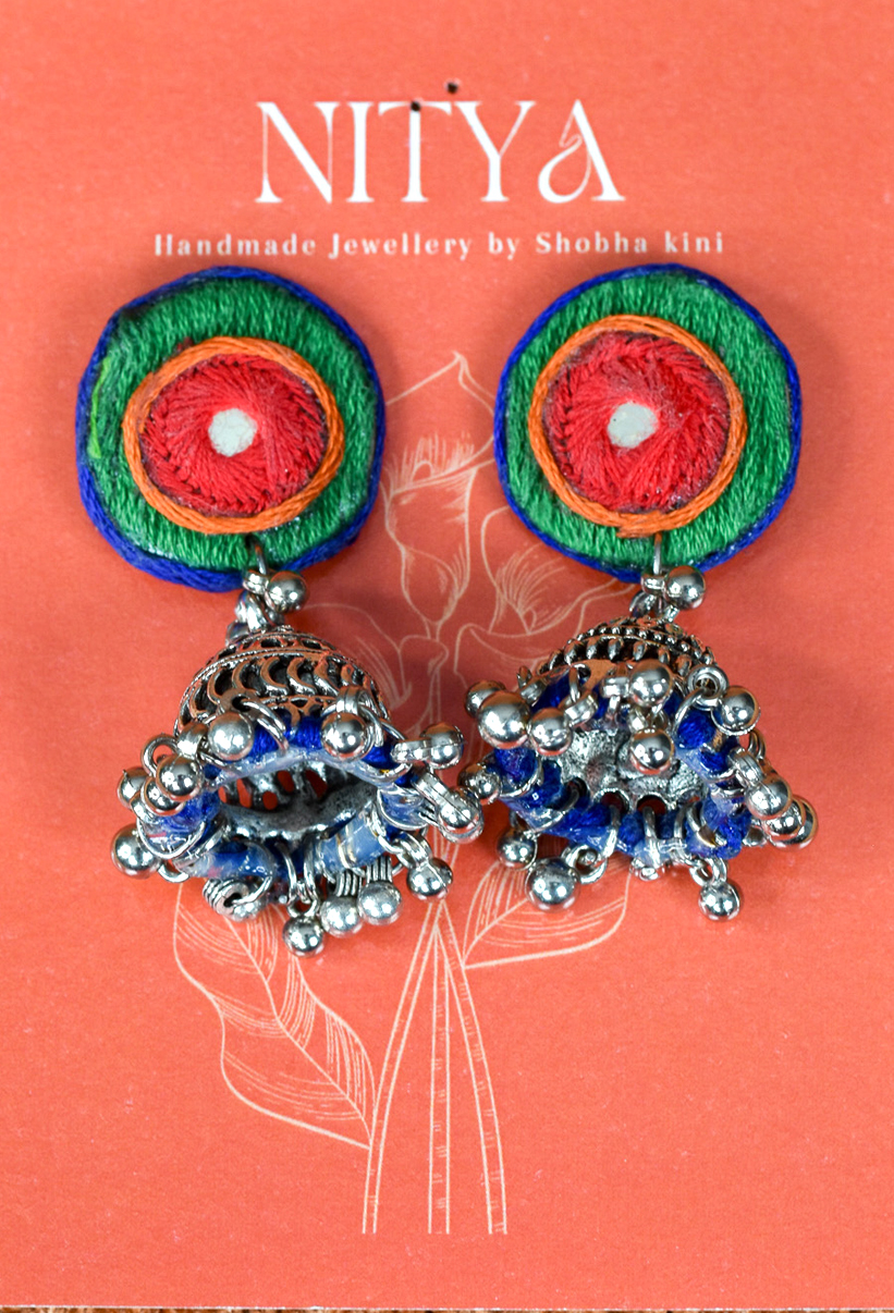 The RangMandal Jhumkas bring alive the vibrance of festive traditions. Featuring hand-embroidered circular studs and intricate silver bells, they capture the joyful chime of celebration — a perfect blend of craft and charm.