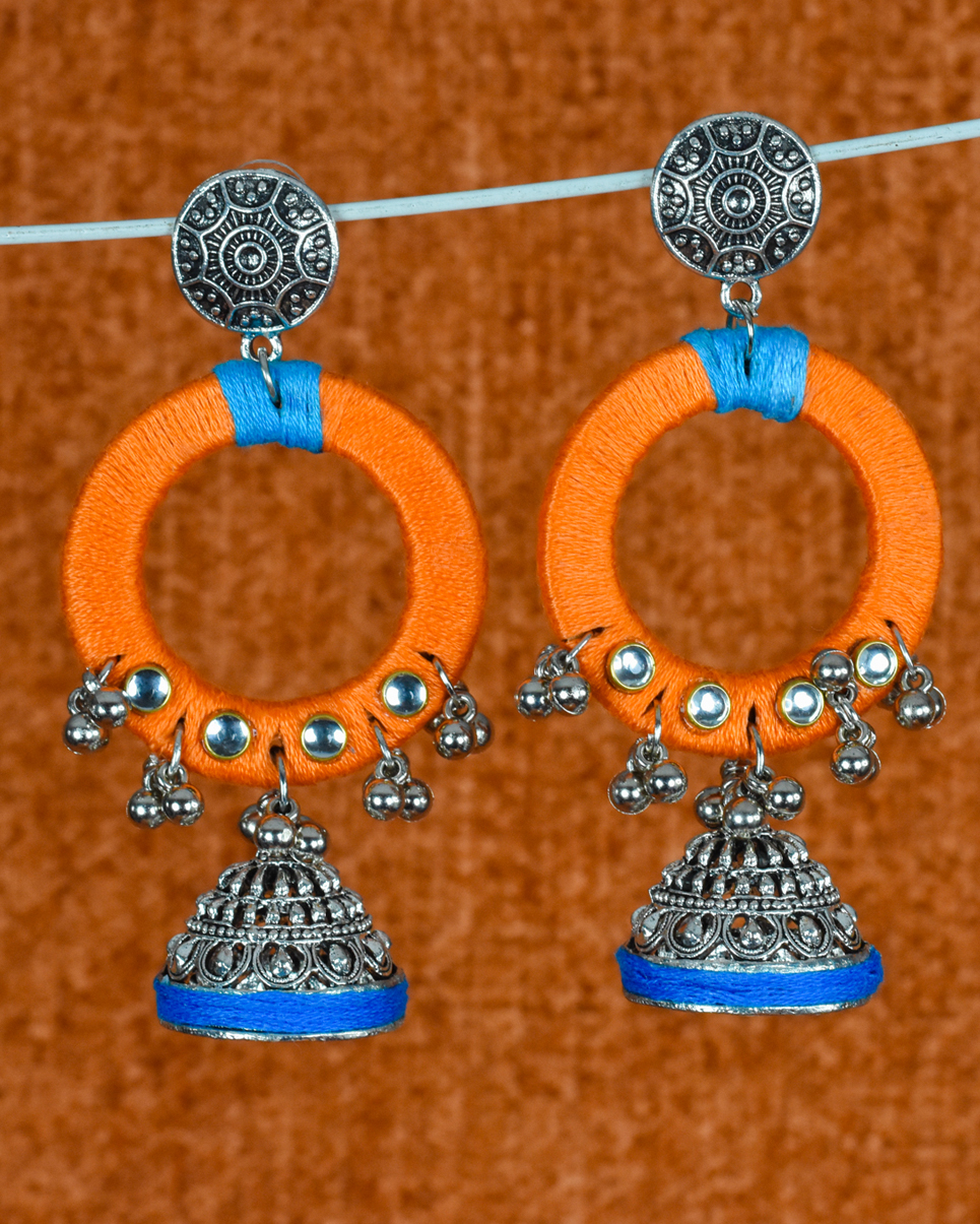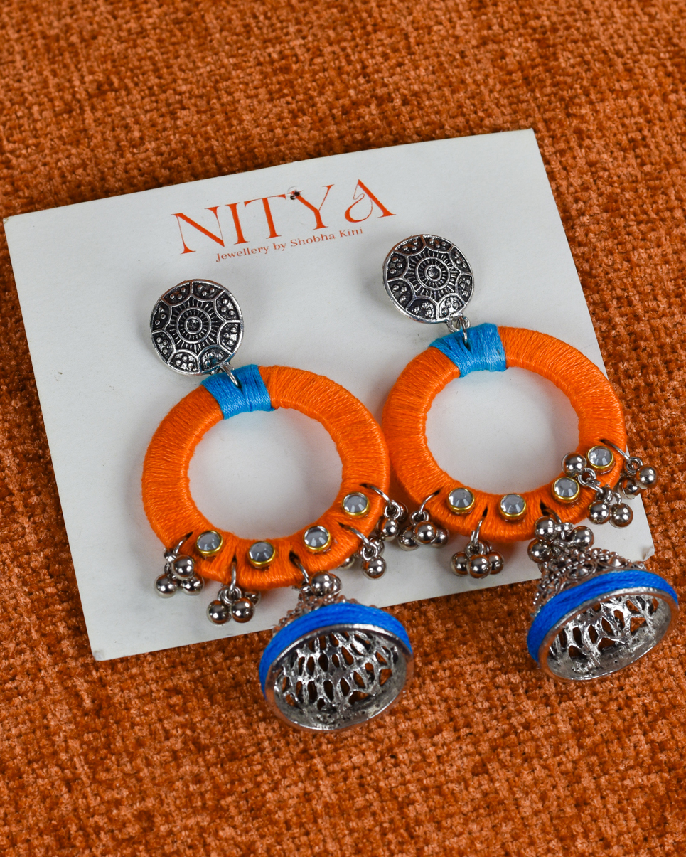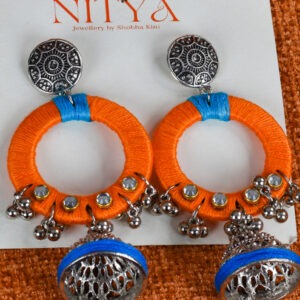 These radiant earrings capture the energy of Navratri with their fiery orange hoops and cool blue accents. Embellished with shimmering stones, jingling silver ghungroos, and bold oxidised jhumkas, they strike the perfect balance of tradition and festivity. Ideal for pairing with bright chaniya cholis under the Garba night lights.