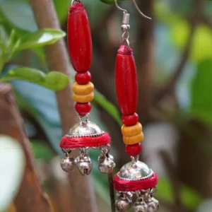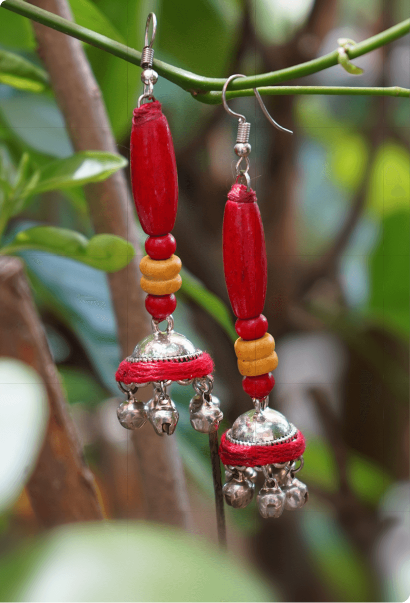 Celebrate tradition with these handcrafted Rangtaali Jhumkas, designed to bring a playful rhythm to your every step. Color: Red, mustard yellow, and silverMaterial: Wooden beads, silver-toned metal, cotton thread