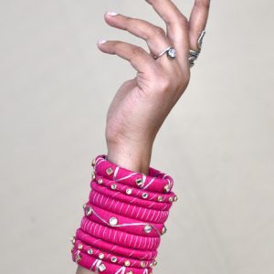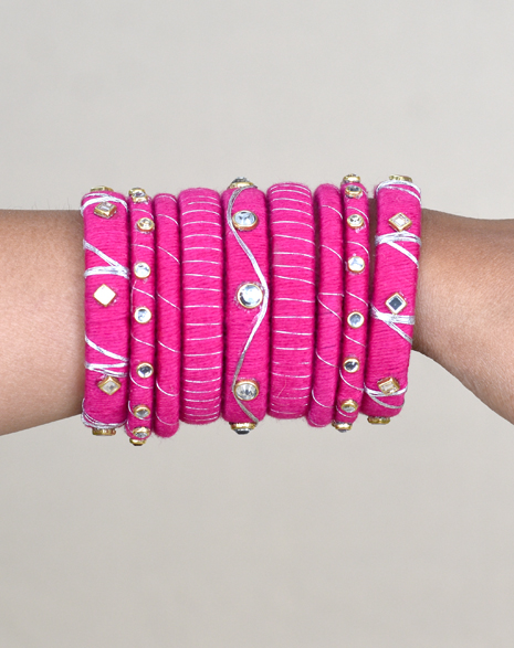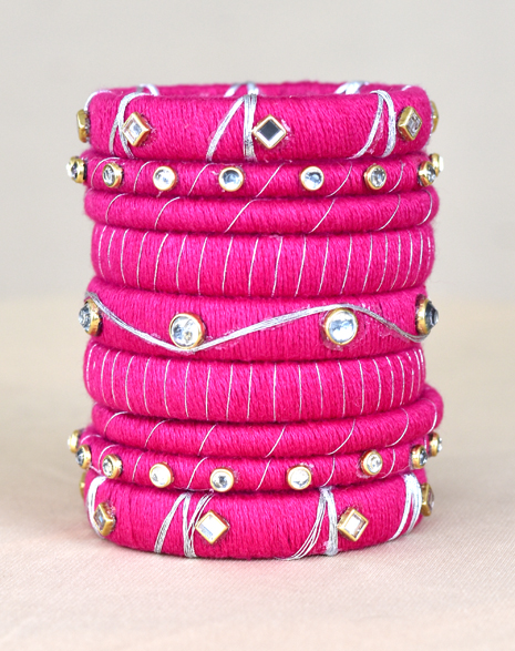 Embrace contemporary ethnic charm with this exquisitely handcrafted silk thread bangle set. Featuring a vibrant shade of Rani Pink (Magenta), this set is uniquely detailed with shimmering silver zari wire instead of traditional gold. The bangles are adorned with sparkling geometric stones and intricate silver winding patterns, offering a fresh and stylish look. This radiant set is the perfect accessory for Sangeet ceremonies, festive parties, and wedding celebrations. The soft thread finish ensures a comfortable, skin-friendly fit for long wear.