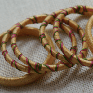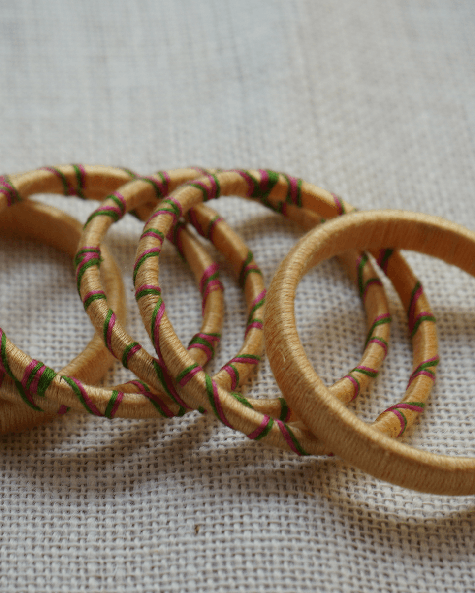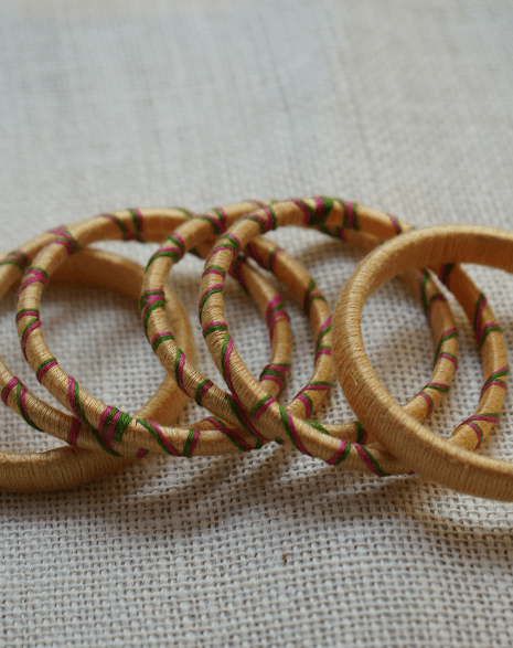 This handcrafted set of 6 bangles features a soft golden silk base, with 4 bangles accented by delicate pink and green thread wrapping. Lightweight and festive, they’re perfect for pairing with ethnic wear, adding a subtle yet joyful touch of tradition.