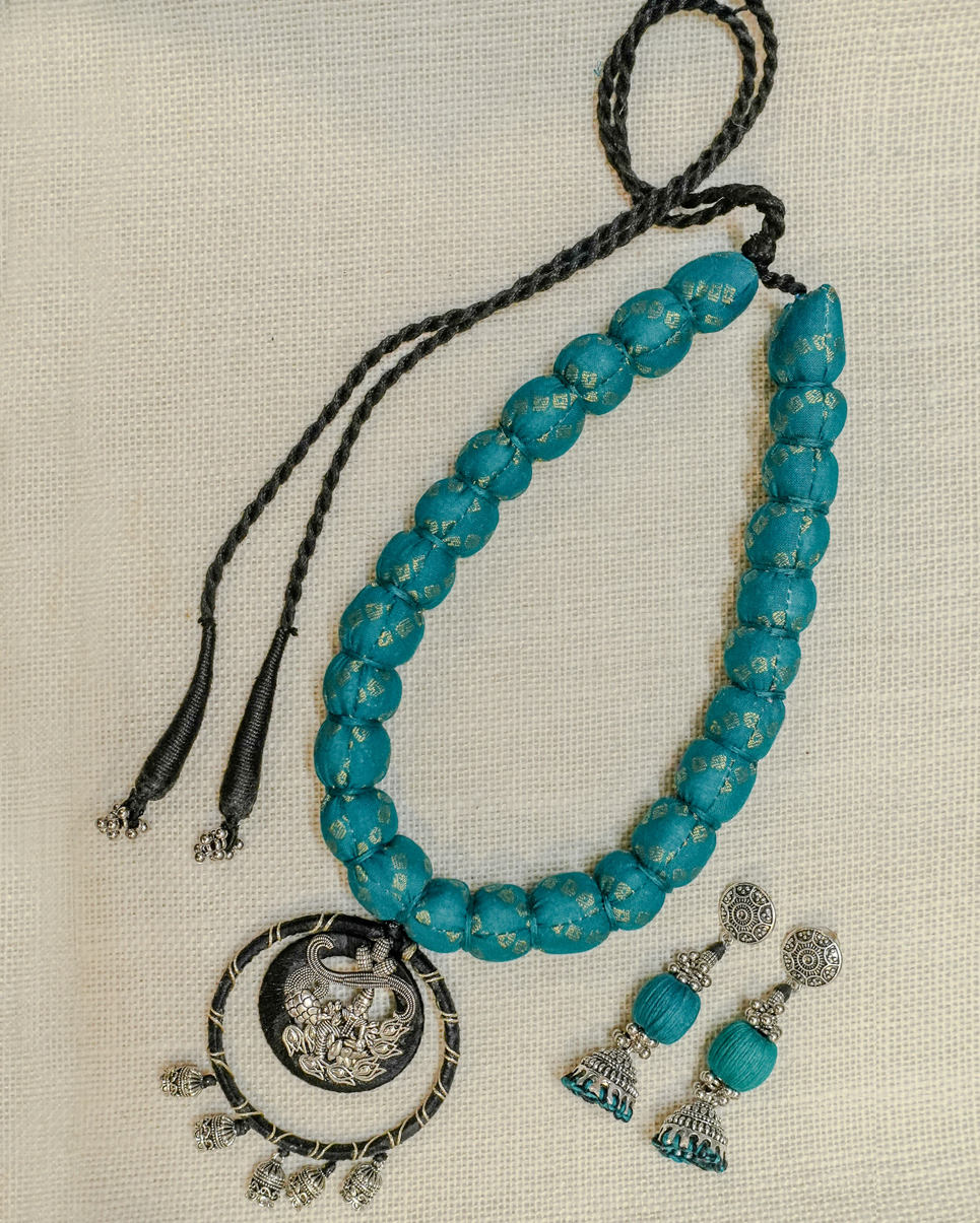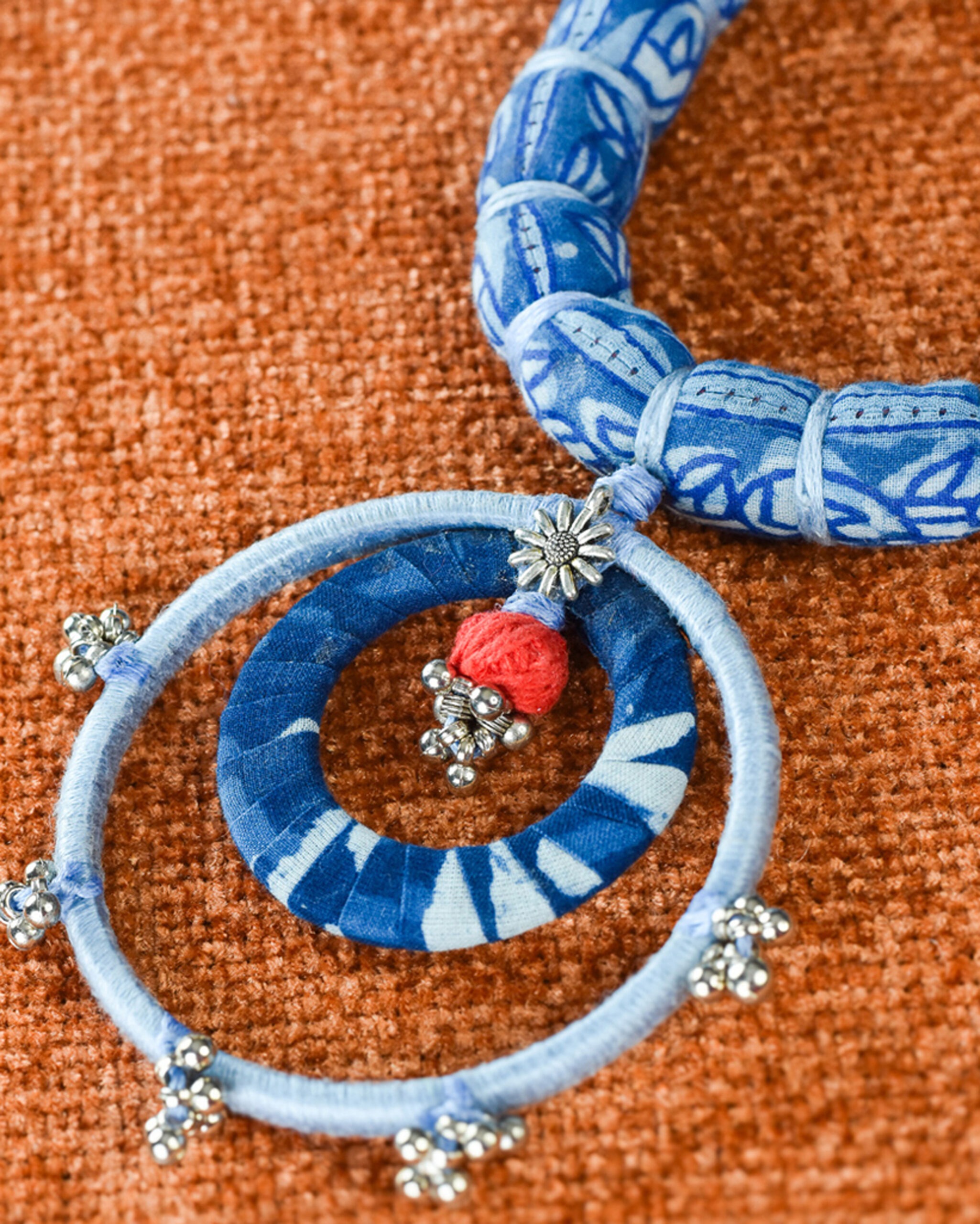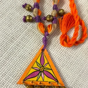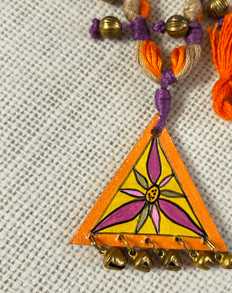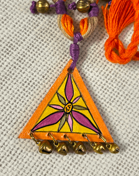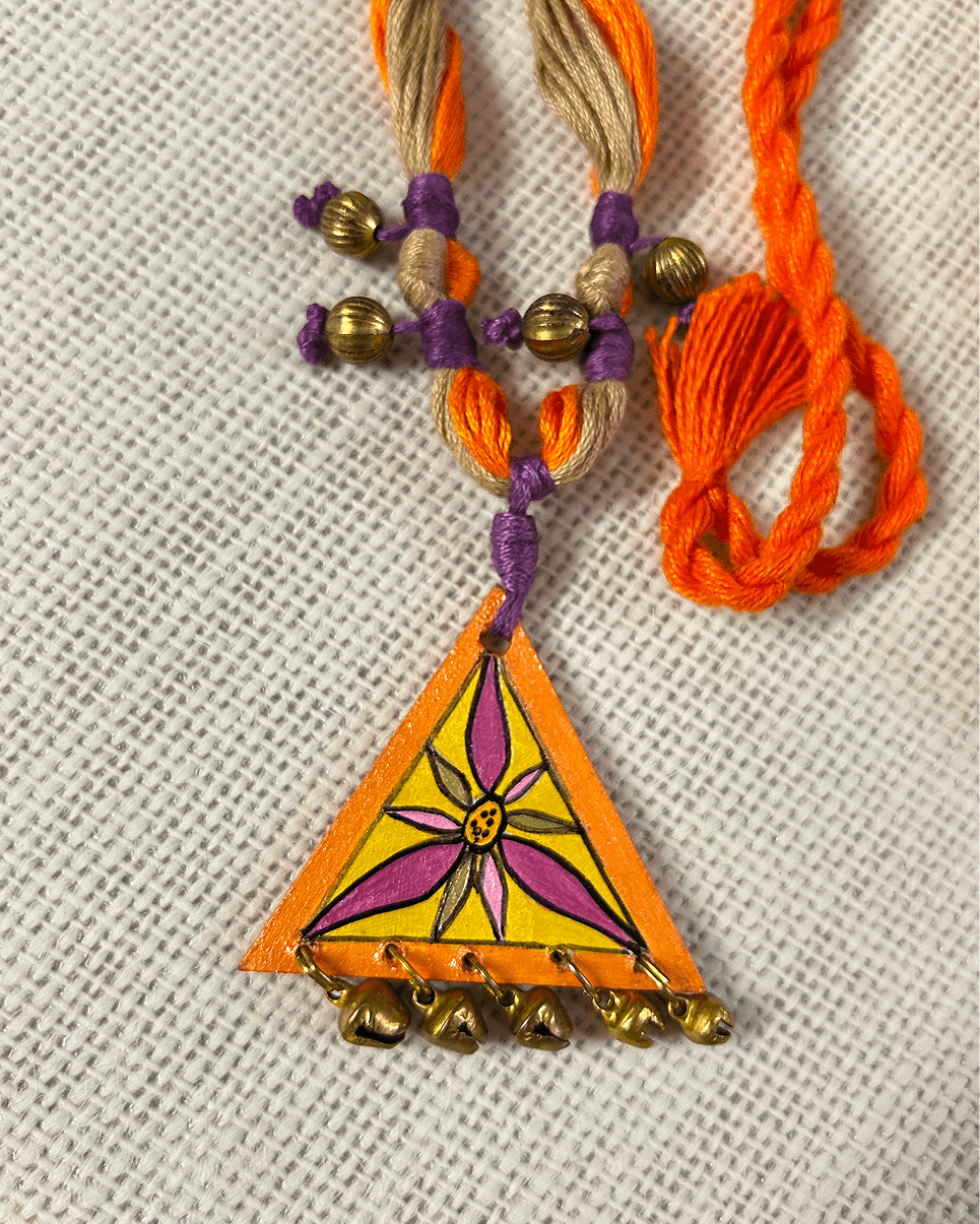 A bold triangle pendant painted in sunny yellow and vibrant magenta, strung with orange threads and tiny ghungroo bells. Lightweight and full of charm for everyday ethnic flair.