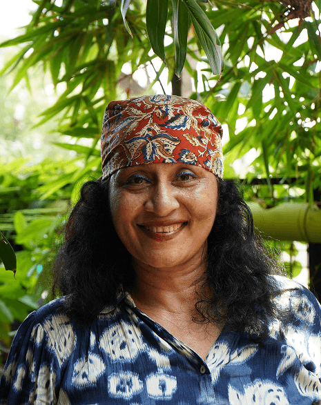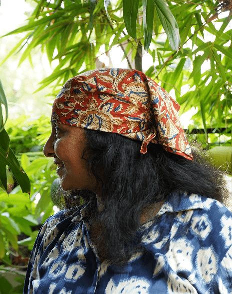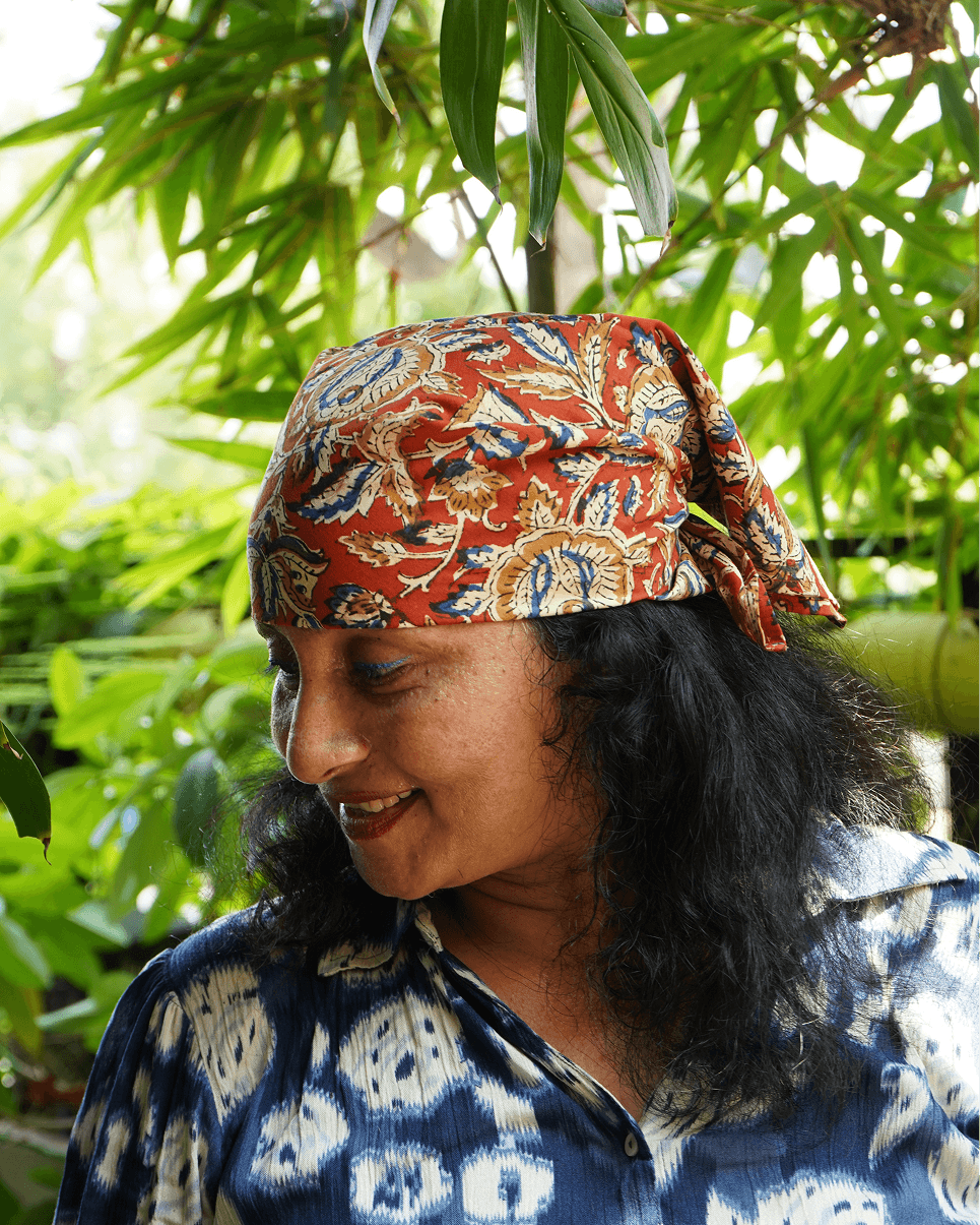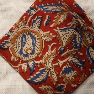 With its rich terracotta base and bold floral motifs in navy and beige, this bandana captures the elegance of traditional Kalamkari art.