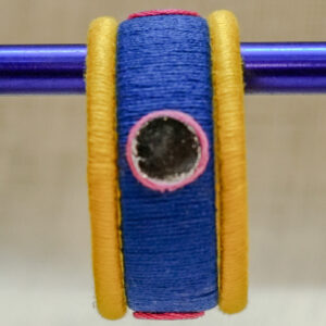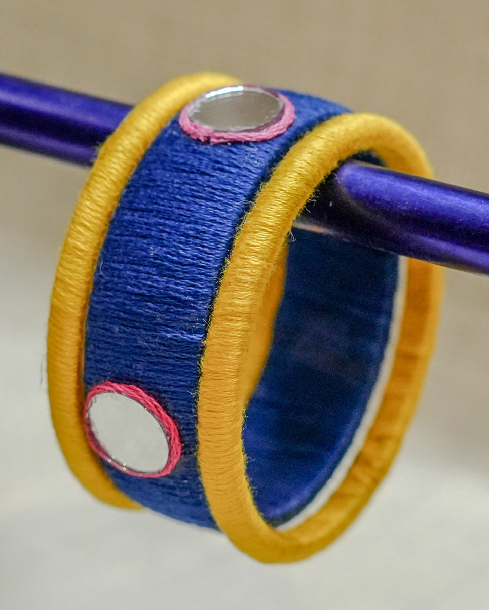 Color: Royal blue, marigold yellow, and soft pink Material: Fabric thread-wrapped plastic bangles with mirror embellishments