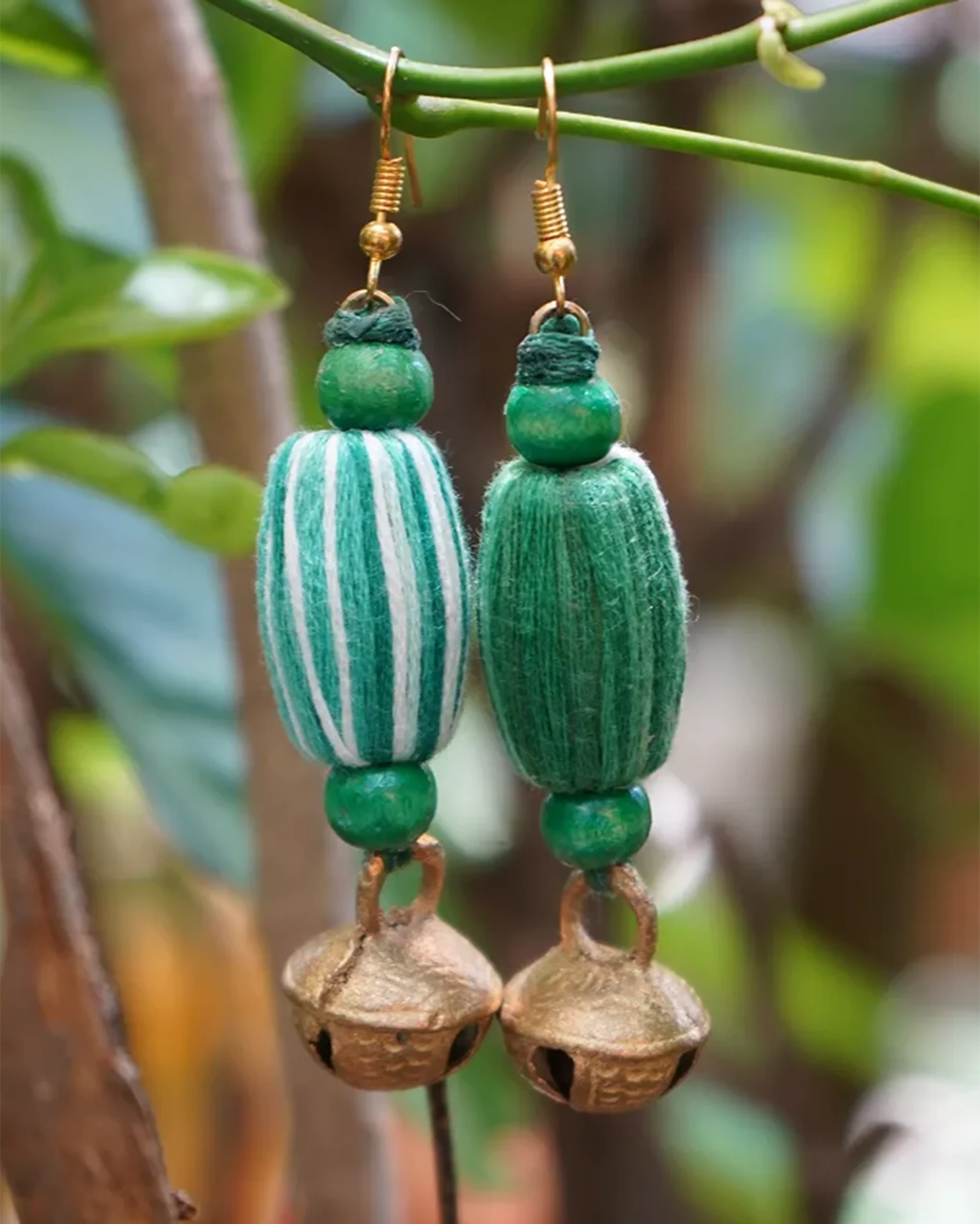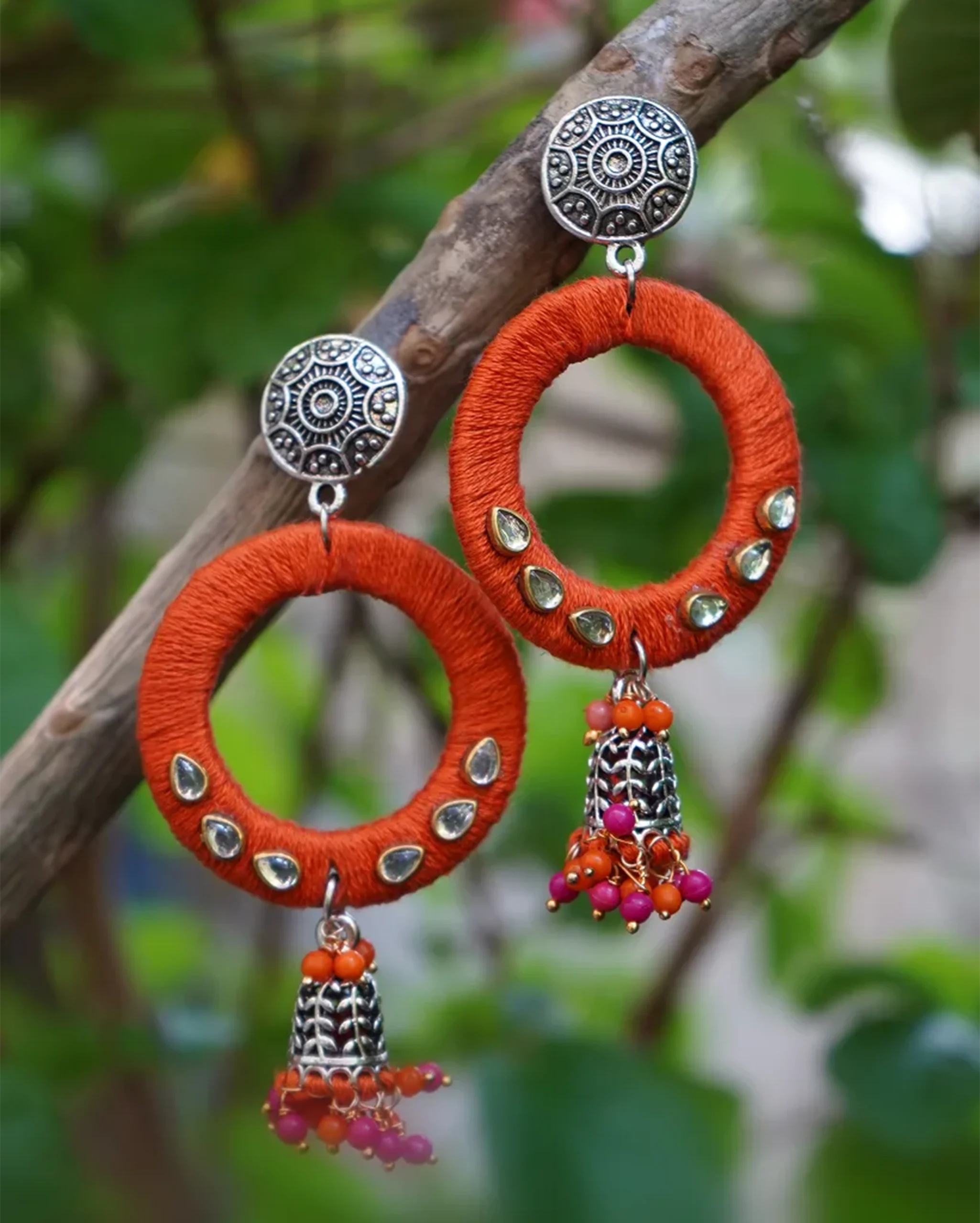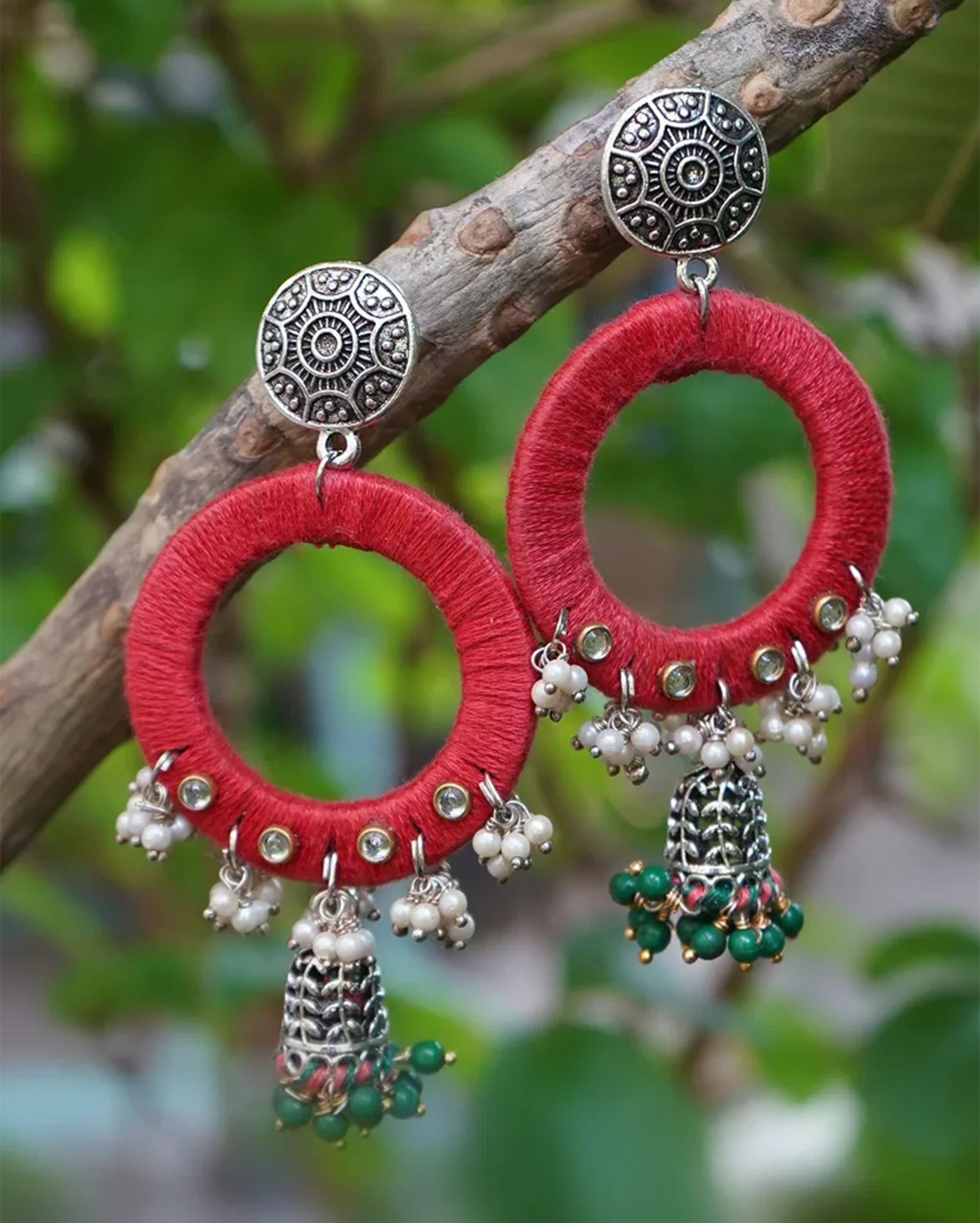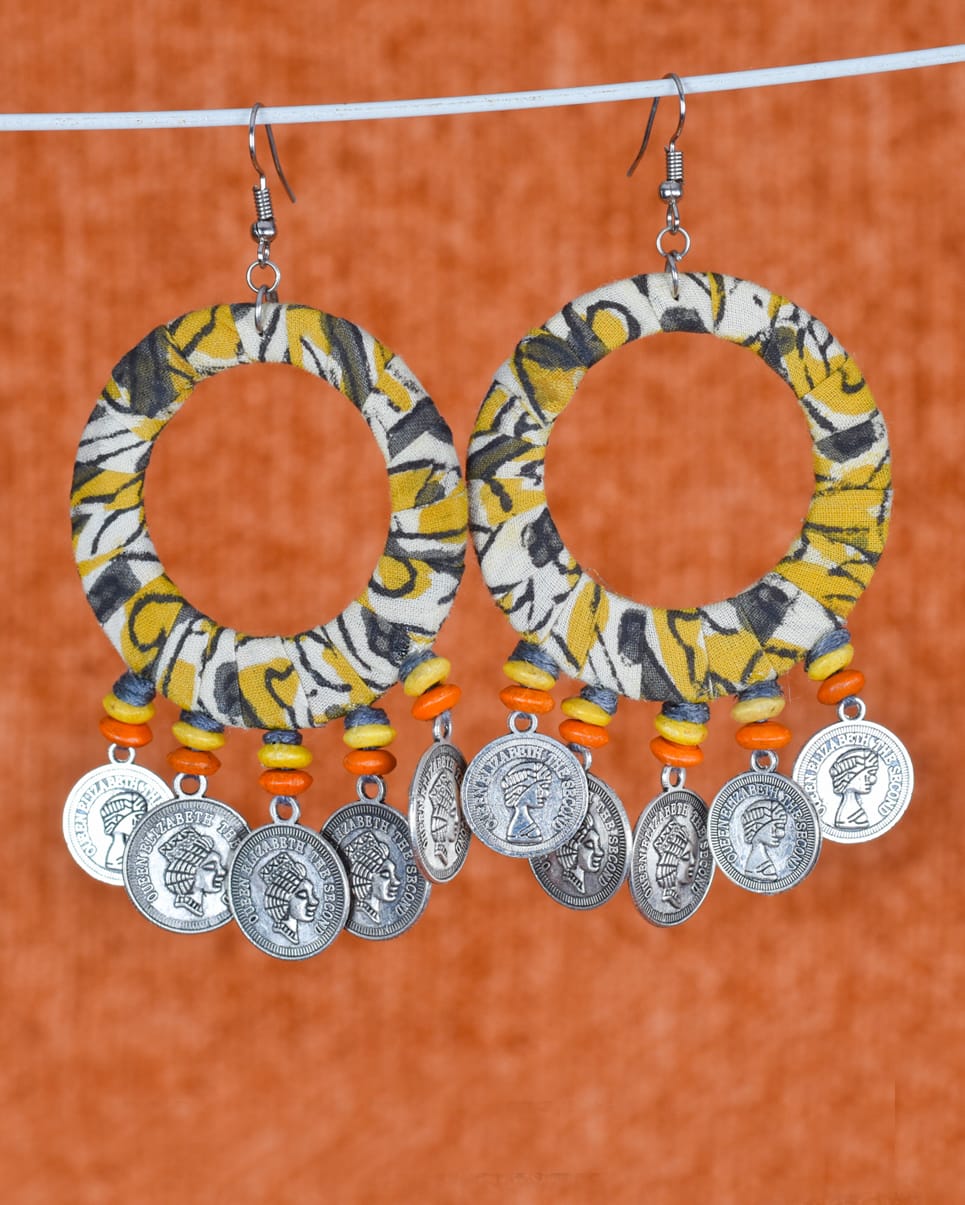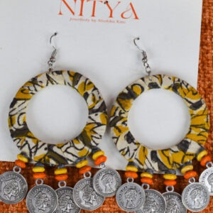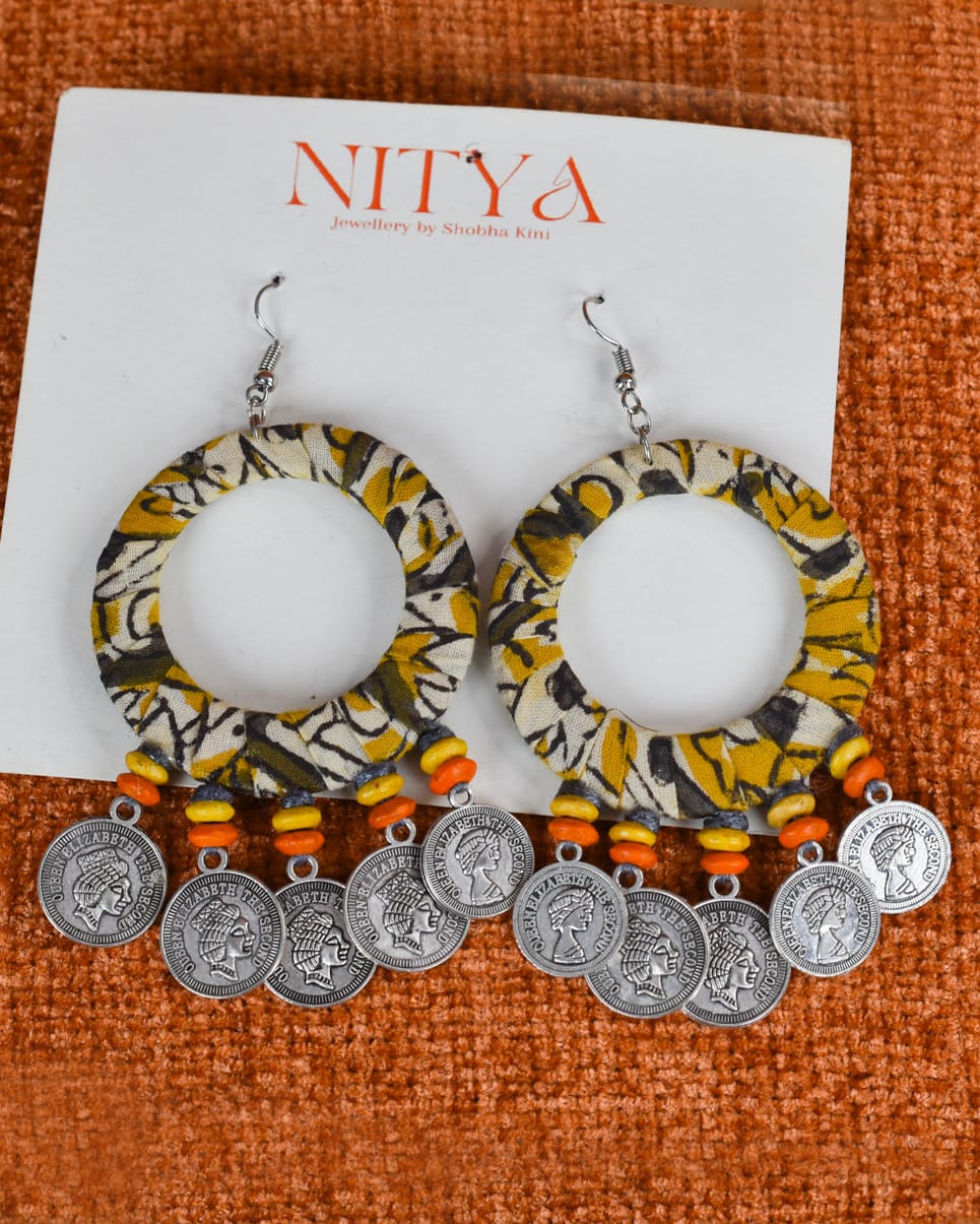 Radiate festive energy with these bold yellow-and-black fabric-wrapped hoop earrings, designed to echo the golden glow of Navratri mornings. Accented with bright wooden beads and silver coin charms, they move with rhythm and grace, perfect for your garba twirls and dandiya beats.