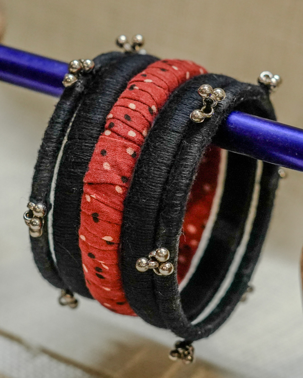 Color: Black, crimson red, and silver Material: Fabric and thread–wrapped plastic bangles with metallic embellishments