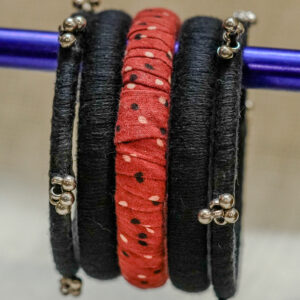 Drawing inspiration from glowing diyas and flickering embers, Taamra Jyoti Bangles radiates festive warmth. The crimson-red center bangle wrapped in printed fabric contrasts beautifully with the matte black surround, while silver beads add a hint of sparkle. A handcrafted ode to the spirit of Diwali — fierce, beautiful, and full of light.
