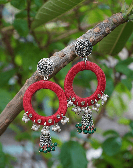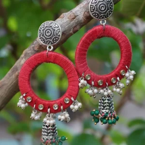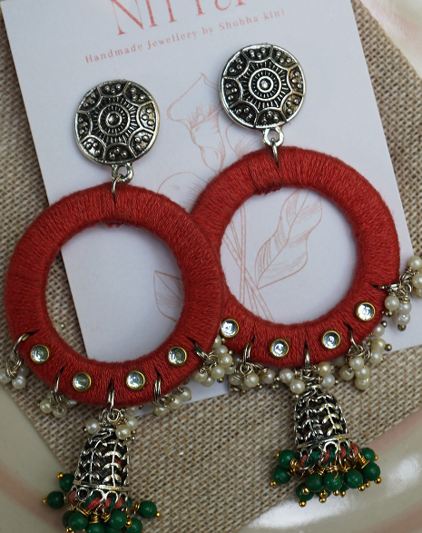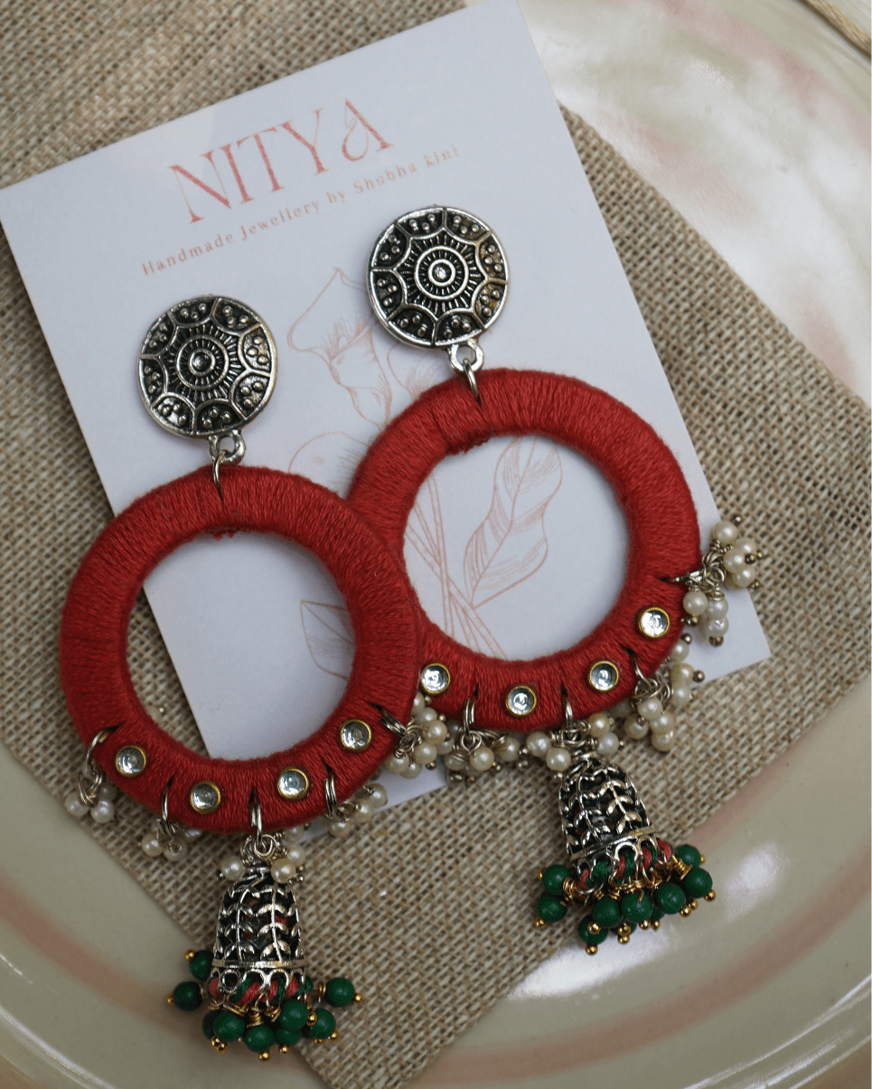 With a perfectly rounded disc shape, the Tamba Mandala Studs embody calm symmetry and grounded style. Their brushed copper sheen is ideal for daily wear or muted festive dressing. Color: Brushed Copper Material: White faux pearls with silver-tone bead caps, Jhumka Drops,