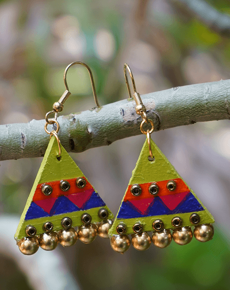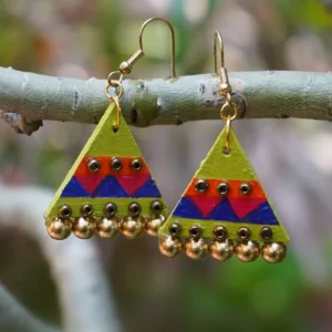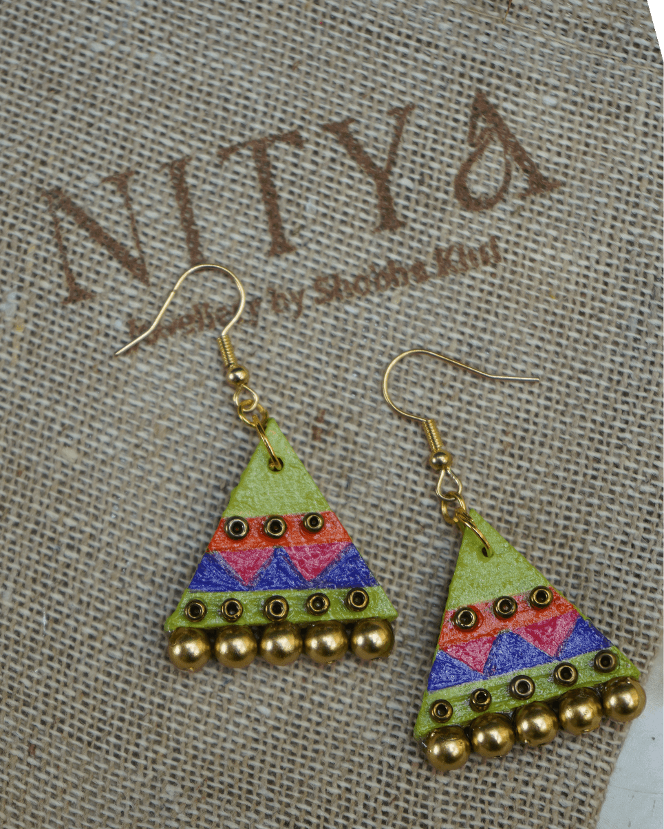 The Tamba Vritta Danglers embody fluid elegance with their swirling copper form. Ideal for festive wear, these earrings add a rustic richness to sarees, lehengas, or Indo-western silhouettes. Color: Polished Copper Material: Hand-painted wooden (mdf) earrings, wooden beads, and gold-toned metal bells