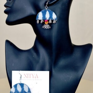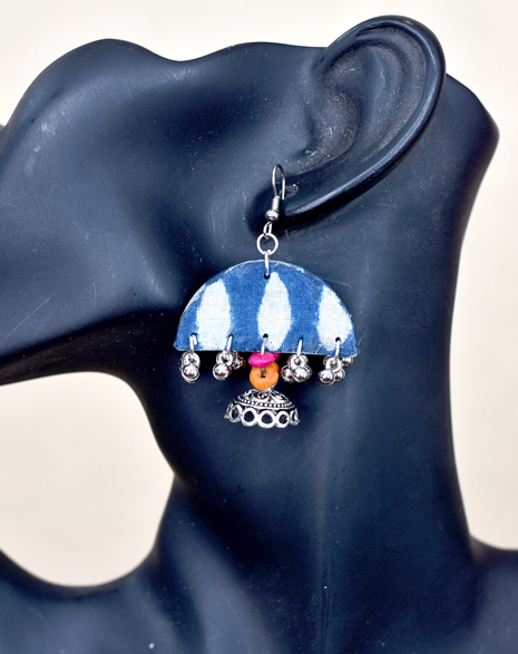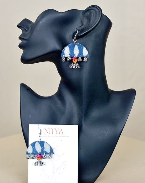 Embrace a playful bohemian vibe with these handcrafted semi-circular earrings. The design features a half-moon base wrapped in soft indigo blue fabric with a classic white Shibori tie-dye motif. Uniquely styled, the bottom curve is lined with tiny silver ghungroos (bells) that add movement and charm. A central dangle featuring vibrant pink and orange beads ends in a petite oxidized silver jhumki, making this lightweight pair the perfect fun accessory for summer dresses and kurtis.
