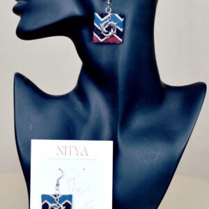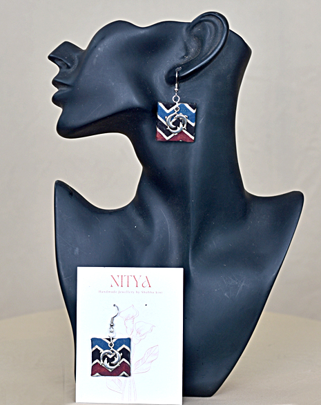 Capture a whimsical artistic vibe with these unique handcrafted fabric earrings. The design features a neat square base wrapped in a bold navy blue and maroon zigzag (chevron) print. The centerpiece of this design is a charming oxidized silver motif of three dolphins swimming in harmony, placed directly on the fabric. Unlike traditional jhumkas, this modern design focuses on the interplay between geometric patterns and playful metal accents. Lightweight and quirky, they are perfect for casual outings or adding a boho touch to jeans and kurtis.