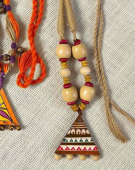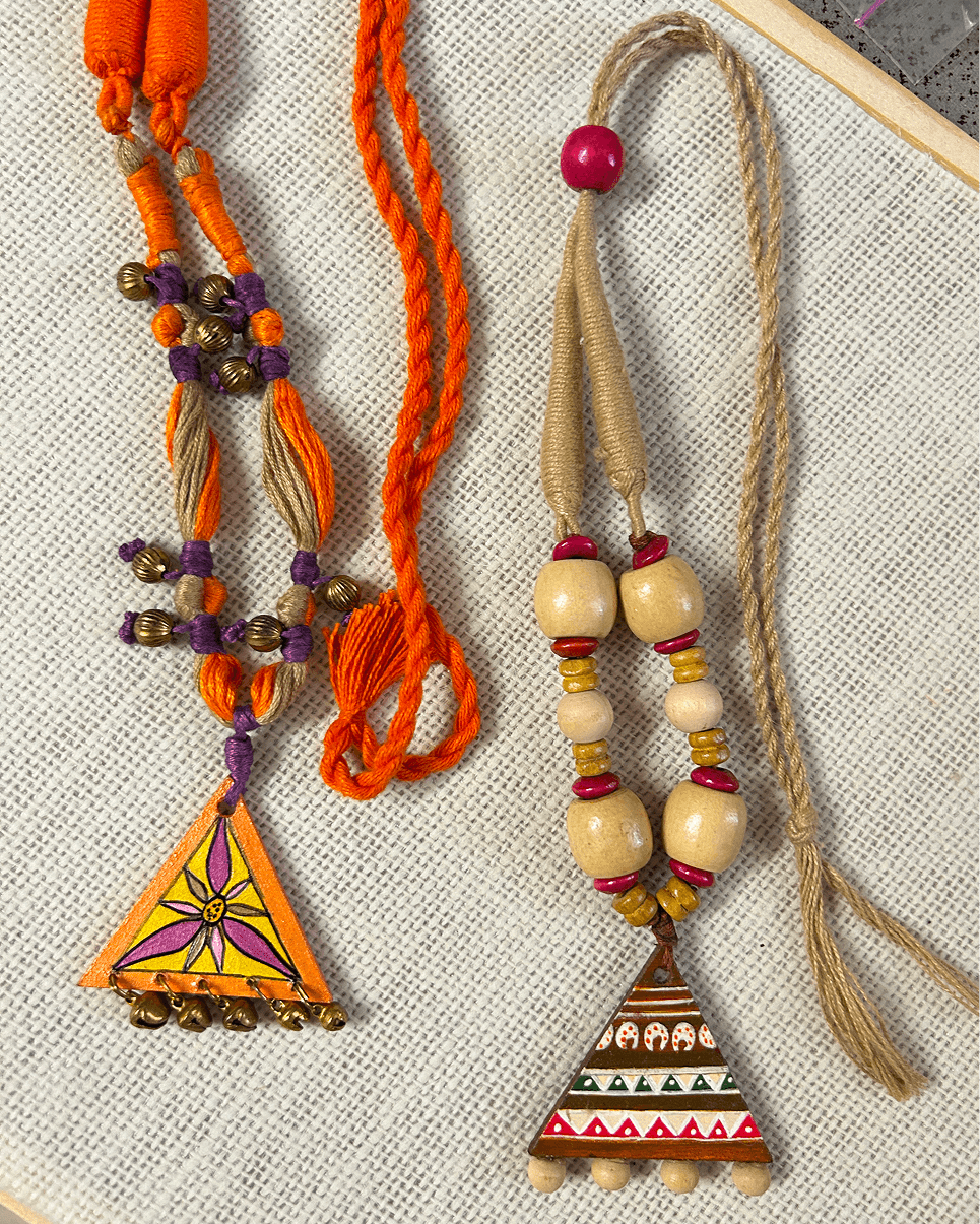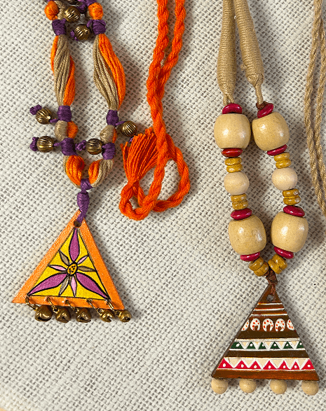 This pair of hand-painted triangle pendants feature earthy beads, thread tassels, and vibrant folk motifs. One pops in orange and yellow, while the other leans into natural tones with traditional patterns.