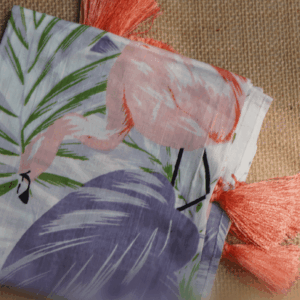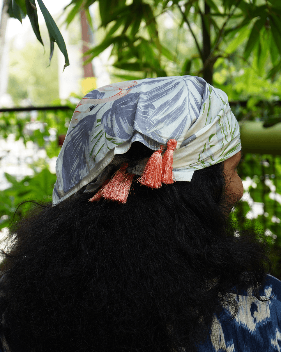 This soft off-white bandana features dreamy botanical prints in lavender, sage, and blush, finished with coral tassels for a playful twist. Made from a lightweight cotton-blend fabric, it’s breezy, elegant, and perfect for sunny days, vacations, or a garden stroll.