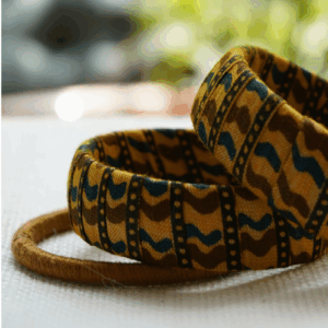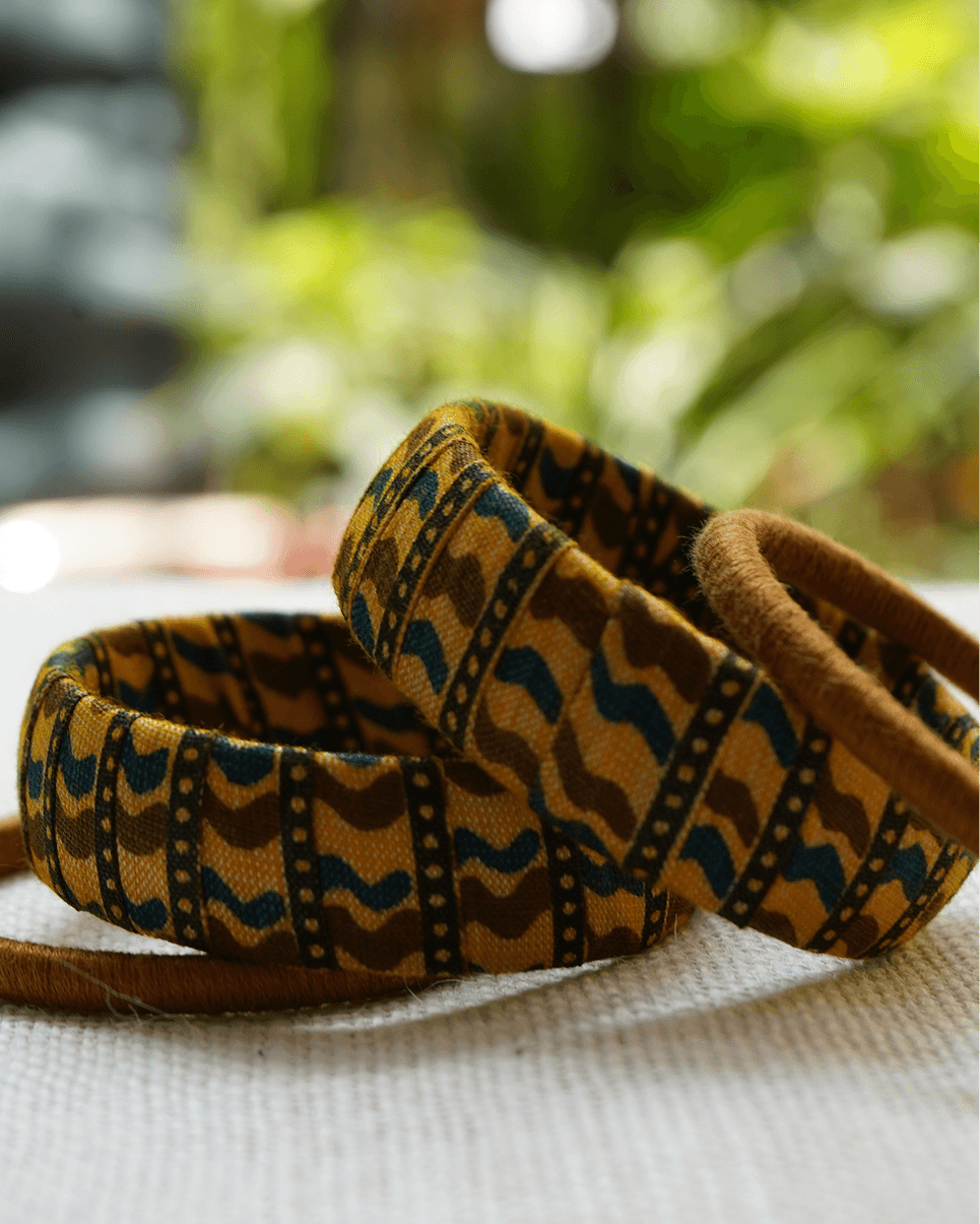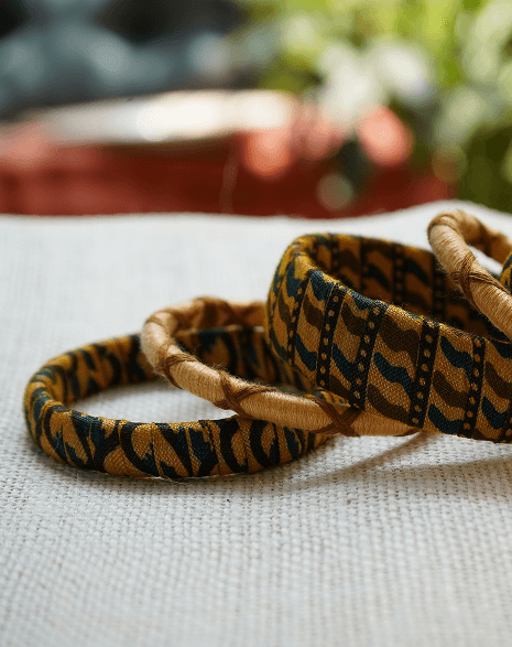 This set of 3 handcrafted bangles includes two cotton fabric-wrapped bangles in mustard and indigo tribal print, paired with one golden thread-wrapped bangle in a crisscross pattern.
